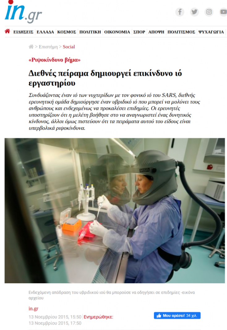 «Ερευνητές στις ΗΠΑ, την Ελβετία και την Κίνα αναφέρουν στην επιθεώρηση Nature Medicine ότι δημιούργησαν τον νέο ιό συνδυάζοντας τμήματα του ιού του SARS και ενός συγγενικού κοροναϊού των νυχτερίδων με την ονομασία SHC014..