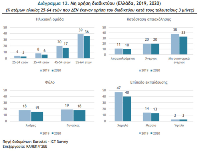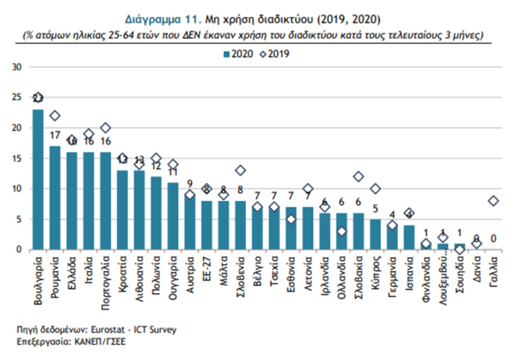 Με βάση τα στοιχειά για το 2020, το 16% του ενήλικου πληθυσμού́ ηλικίας 25-64 ετών δεν έχει κάνει χρήση του διαδικτύου κατά τους τελευταίους τρεις μήνες, ποσοστό́ διπλάσιο του ευρωπαϊκού́ μέσου όρου (8%), και το τρίτο μεγαλύτερο στην Ευρωπαϊκή Ένωση, μετά τη Βουλγαρία και τη Ρουμανία. Αυτό προκύπτει από το νέο «Κείμενο Παρέμβασης» του Κέντρου Ανάπτυξης Εκπαιδευτικής Πολιτικής της ΓΣΕΕ (ΚΑΝΕΠ-ΓΣΕΕ) με τίτλο «Ενήλικες και προγράμματα διά βίου εκπαίδευσης στην περίοδο της πανδημίας: η πρόκληση των ψηφιακών δεξιοτήτων».