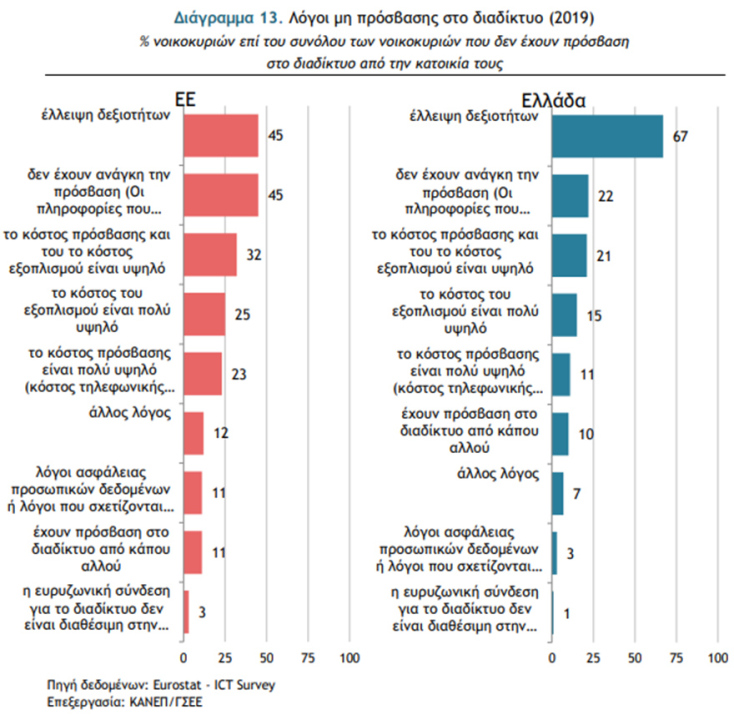 Ο κυριότερος λόγος μη πρόσβασης στο διαδίκτυο είναι η έλλειψη κατάλληλων δεξιοτήτων, με το 67% των νοικοκυριών να δηλώνει πως δεν έχει πρόσβαση στο διαδίκτυο από την κατοικία του λόγω έλλειψης δεξιοτήτων, και όχι τόσο γιατί δεν έχει ανάγκη για πρόσβαση ή γιατί το κόστος της σύνδεσης ή του εξοπλισμού είναι υψηλό.