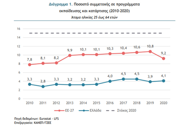 Τα ποσοστά συμμετοχής των ενηλίκων σε προγράμματα εκπαίδευσης και κατάρτισης στη χώρα μας, παραμένουν σε χαμηλά επίπεδα καθ’ όλη τη διάρκεια της δεκαετίας 2010-2020, παρότι στα πλαίσια της ευρωπαϊκής ατζέντας από το 2010 έχει τεθεί συγκεκριμένος μετρήσιμος στόχος για τη δια βίου μάθηση, προκειμένου να αυξήσουν τα κράτη-μέλη τα ποσοστά τους ώστε το 2020 ο ευρωπαϊκός μέσος όρος να είναι τουλάχιστον 15%. Στην Ελλάδα, με βάση τον επίσημο δείκτη παρακολούθησης το ποσοστό συμμετοχής των ενηλίκων σε προγράμματα εκπαίδευσης και κατάρτισης κυμαίνεται περίπου στο 4% την δεκαετία 2010-20, τιμή που απέχει κατά πολύ από τον τιθέμενο στόχο αλλά και από τον ευρωπαϊκό μέσο όρο, ο οποίος το 2020 έχει διαμορφωθεί στο 9,2%.