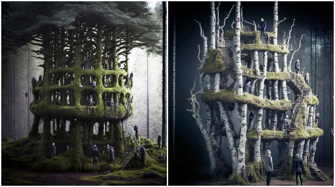 Στη σειρά «Tree Manipulation», ο Σουηδός αρχιτέκτονας, με τη βοήθεια του Midjourney, υφαίνει ρίζες και κλαδιά από άλση σημύδων και πεύκων περίτεχνα σε γιγαντιαίους παιδότοπους, αλλόκοτους πύργους-παρατηρητήρια και πυκνά δάση μέσα σε δάση.