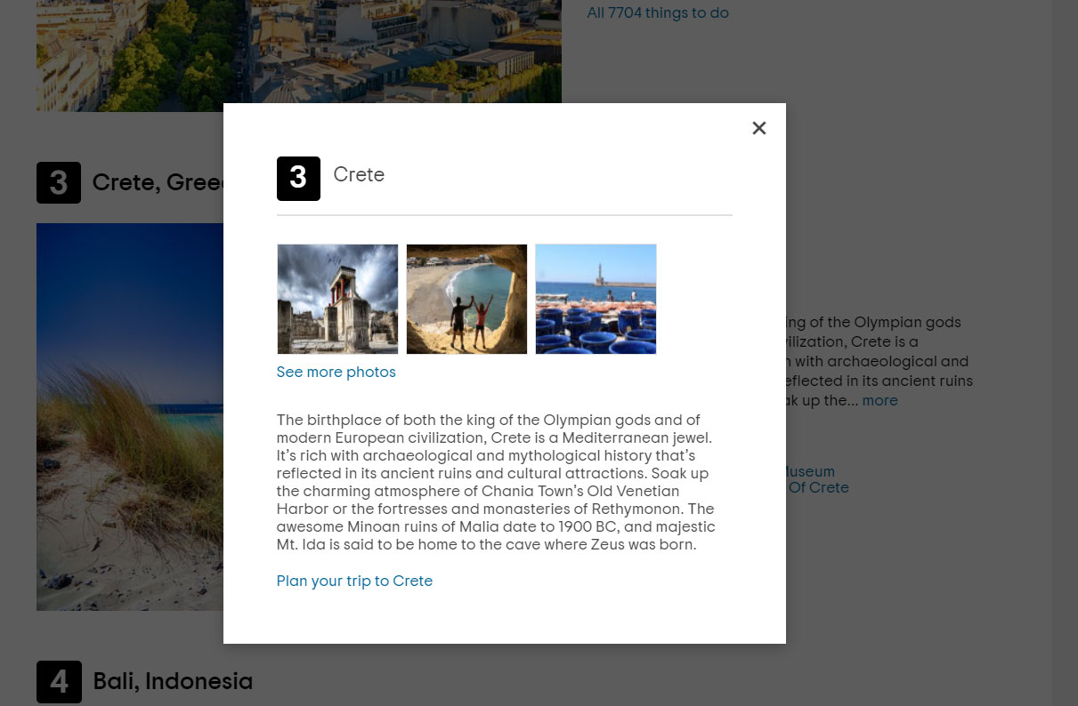 Τρίτη είναι η Κρήτη για την οποία το TripAdvisor αναφέρει: «Γενέτειρα του βασιλιά των Ολύμπιων Θεών (σ.σ. Δία) και κοιτίδα μοντέρνου ευρωπαϊκού πολιτισμού, η Κρήτη αποτελεί "κόσμημα" στη Μεσόγειο. Με πλούσια αρχαιολογική και μυθολογική ιστορία που αντικατοπτρίζεται στα αρχαία ερείπια και τα πολιτιστικά αξιοθέατα του νησιού. Απολαύστε τη γοητευτική ατμόσφαιρα του Παλαιού Ενετικού Λιμανιού της πόλης των Χανίων ή των φρουρίων και των μοναστηριών του Ρεθύμνου».