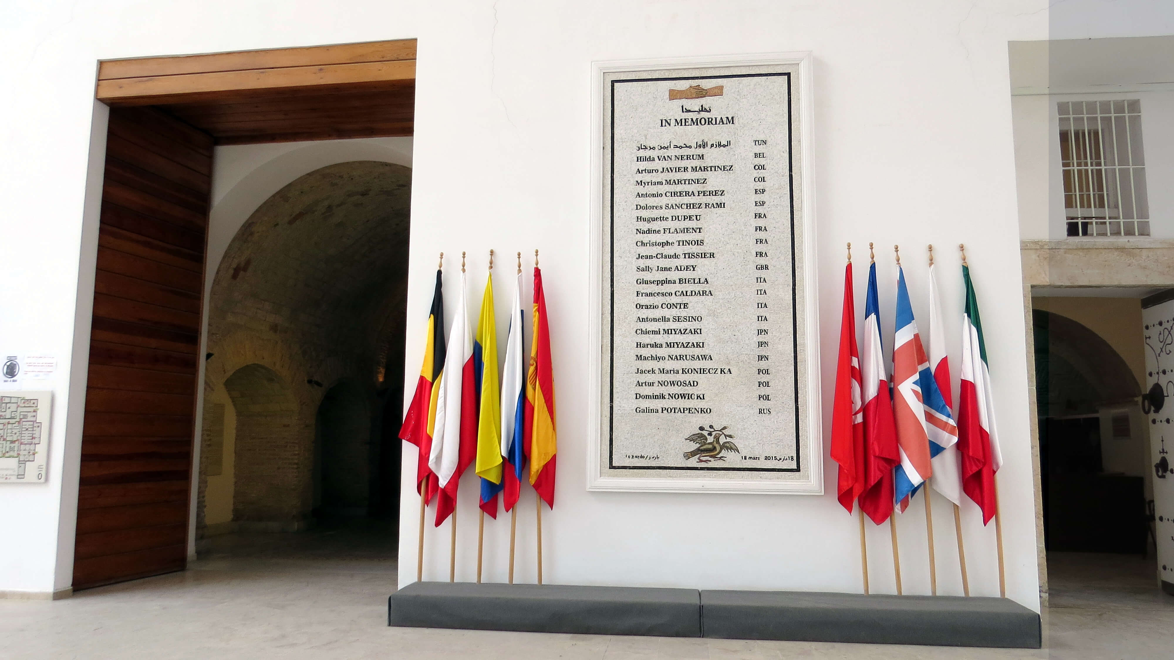 Λίγα μέτρα μακριά από το γκισέ των εισιτηρίων, στέκει ένα ιδιαίτερο μνημείο. Δεν είναι αρχαίο αλλά πολύ πρόσφατο. Δεν αφηγείται μια ένδοξη ιστορία αλλά μιας από τις πιο πικρές που έχει να αφηγηθεί αυτός ο τόπος. Στις 18 Μαρτίου του 2015, λίγες εβδομάδες μετά την επίθεση στα γραφεία του Charlie Hebdo στο Παρίσι, 24 άνθρωποι έχασαν τη ζωή τους όταν τρεις ένοπλοι τρομοκράτες έσπειραν τον θάνατο, χωρίς ακόμα να έχει διασαφηνιστεί αν το έκαναν στο όνομα του ISIS ή της al-Qaeda.