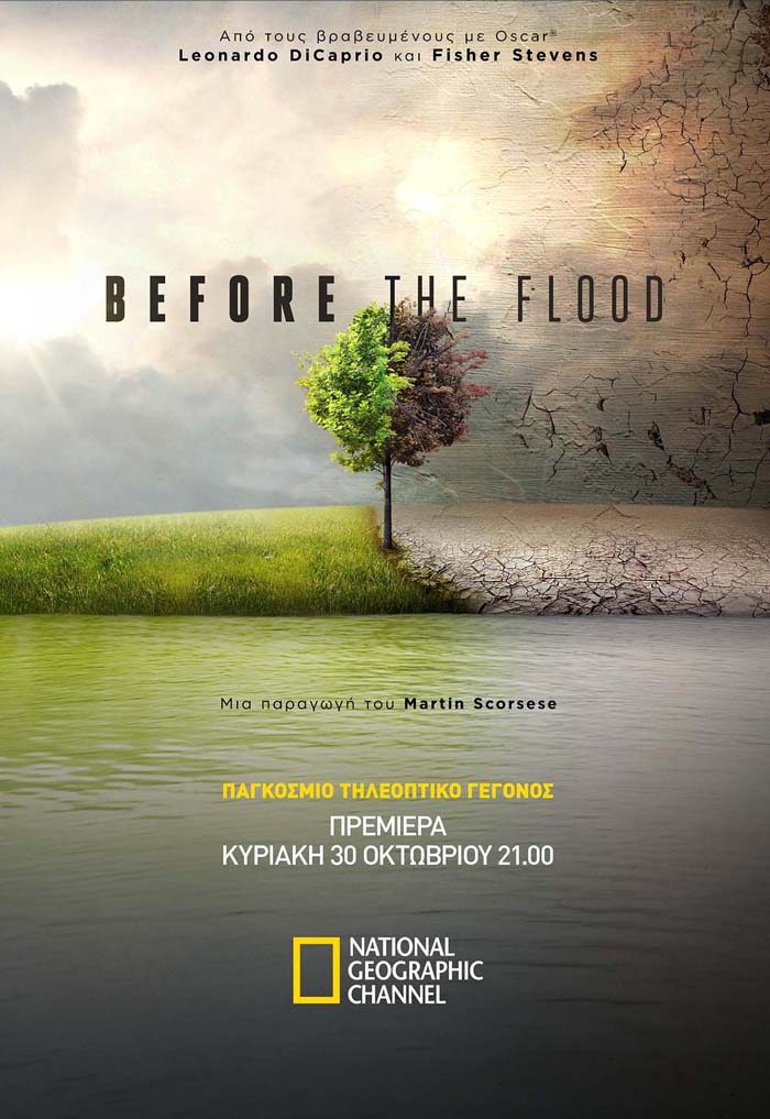 Μετά τον πρόσφατο ορισμό του ως «Αγγελιοφόρος της Ειρήνης για την Κλιματική Αλλαγή» από τον Ο.Η.Ε., o βραβευμένος με Oscar Leonardo DiCaprio αναλαμβάνει ένα ρόλο ζωής, ξεκινώντας ένα δύσκολο ταξίδι από τις μακρινές όχθες της Γροιλανδίας έως τα φλεγόμενα δάση στη Σουμάτρα και τις μυστικές αίθουσες στο Βατικανό, αναζητώντας απαντήσεις σε αυτό το ερώτημα. Το «Before The Flood» παρουσιάζει με επιστημονικά παραδείγματα, την επιδείνωση της περιβαλλοντικής κρίσης που διαταράσσει την ισορροπία του κλίματος στον πλανήτη, ενώ μας φέρνει αντιμέτωπους με την αλήθεια για το μέγεθος της καταστροφής που έχουμε προκαλέσει στον πλανήτη και για το πόσο χρονικό διάστημα μας απομένει για την εύρεση λύσης, προτού καταστραφεί ολοσχερώς το οικοσύστημα. Ακόμη, συνομιλεί με ισχυρές προσωπικότητες από κάθε πτυχή της κοινωνίας τόσο στις αναπτυσσόμενες όσο και στις ανεπτυγμένες χώρες.