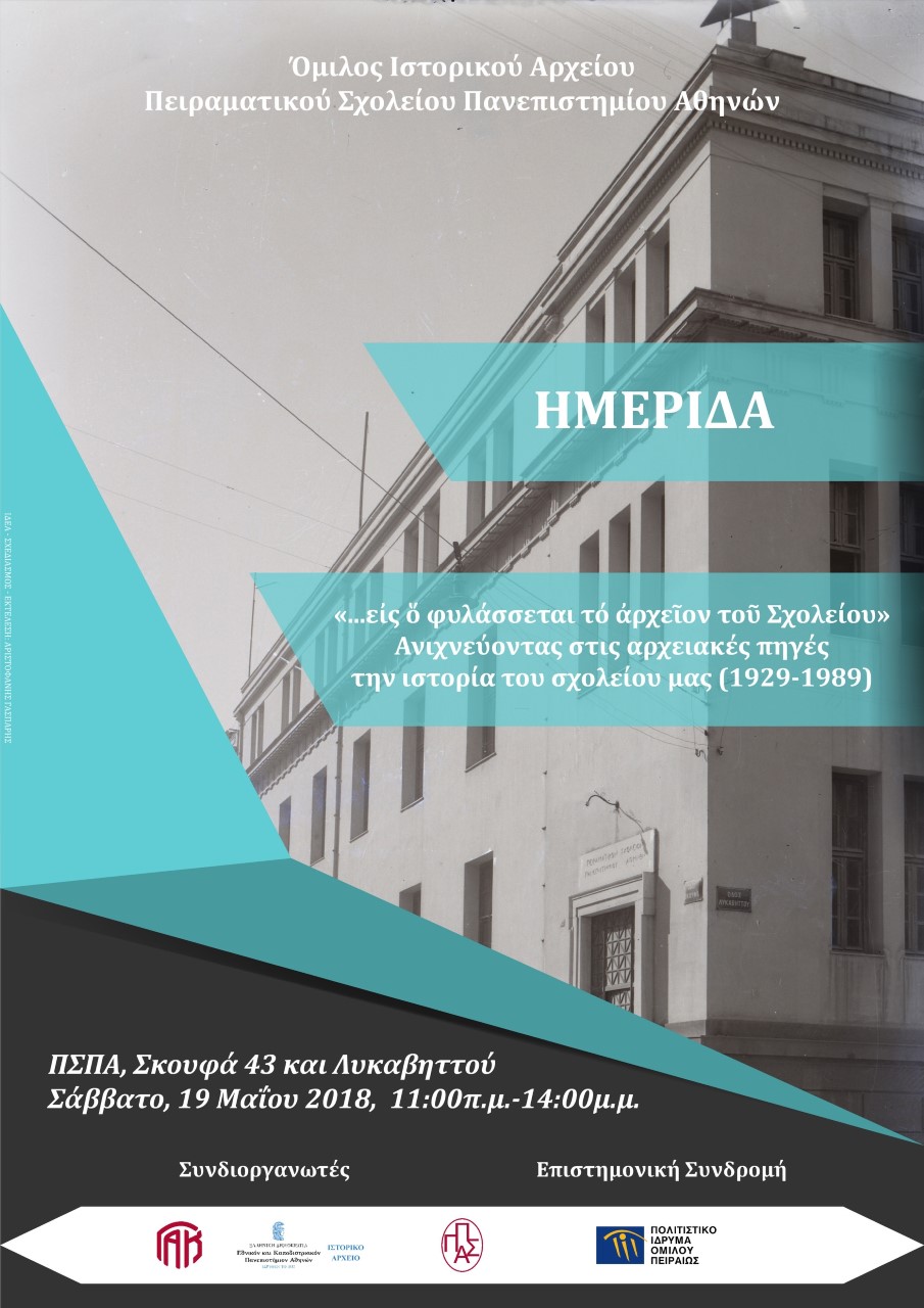 Επιστημονική ημερίδα ανοικτή για το κοινό με τίτλο «...εἰς ὅ φυλάσσεται τό ἀρχεῖον τοῦ Σχολείου: Ανιχνεύοντας στις αρχειακές πηγές την ιστορία του σχολείου μας, 1929-1989» διοργανώνεται με πρωτοβουλία του Ομίλου Ιστορικού Αρχείου του Πειραματικού Σχολείου Πανεπιστημίου Αθηνών στις 19 Μαΐου. Συνδιοργανωτές της εκδήλωσης, που θα πραγματοποιηθεί στο κτήριο του ΠΣΠΑ (Σκουφά 43 και Λυκαβηττού), είναι τα Γενικά Αρχεία του Κράτους και το Ιστορικό Αρχείο του ΕΚΠΑ, ενώ την επιστημονική συνδρομή του προσφέρει και το Ιστορικό Αρχείο του Πολιτιστικού Ιδρύματος Ομίλου Πειραιώς.