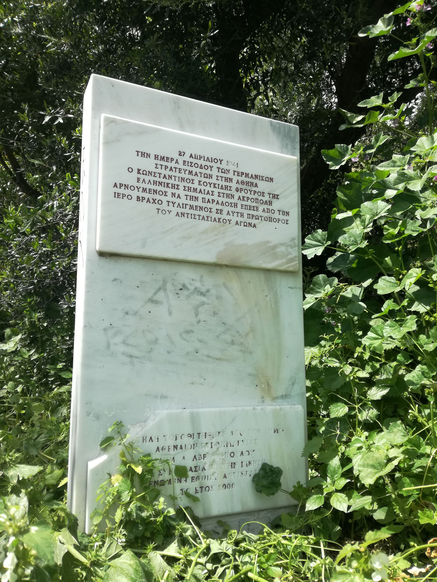Λίγο πριν πάρουμε το μονοπάτι προς τα Αναφιώτικα, το μάτι πέφτει πάνω σε ένα κάτασπρο εκκλησάκι, σκαρφαλωμένο πάνω σε έναν βράχο, τον Άγιο Γεώργιο του Βράχου. Λίγα μέτρα πιο κει, διαβάζοντας μία ενεπίγραφη πλάκα μαθαίνουμε ότι σε εκείνο το σημείο έπεσε νεκρός στις 27/04/1941 ο Εύζωνος Κ. Κουκίδης, όταν πήδηξε από την Ακρόπολη, τυλιγμένος με την ελληνική σημαία, αρνούμενος να την παραδώσει στα γερμανικά στρατεύματα που μπήκαν τότε στην Αθήνα. Οι πληροφορίες αυτές δεν είναι ιστορικά τεκμηριωμένες αλλά βασίζονται σε μαρτυρίες ανθρώπων. Σηκώνοντας το βλέμμα προς τα πάνω, η θέα του βράχου της Ακρόπολης με την ελληνική σημαία να κυματίζει είναι συναρπαστική.