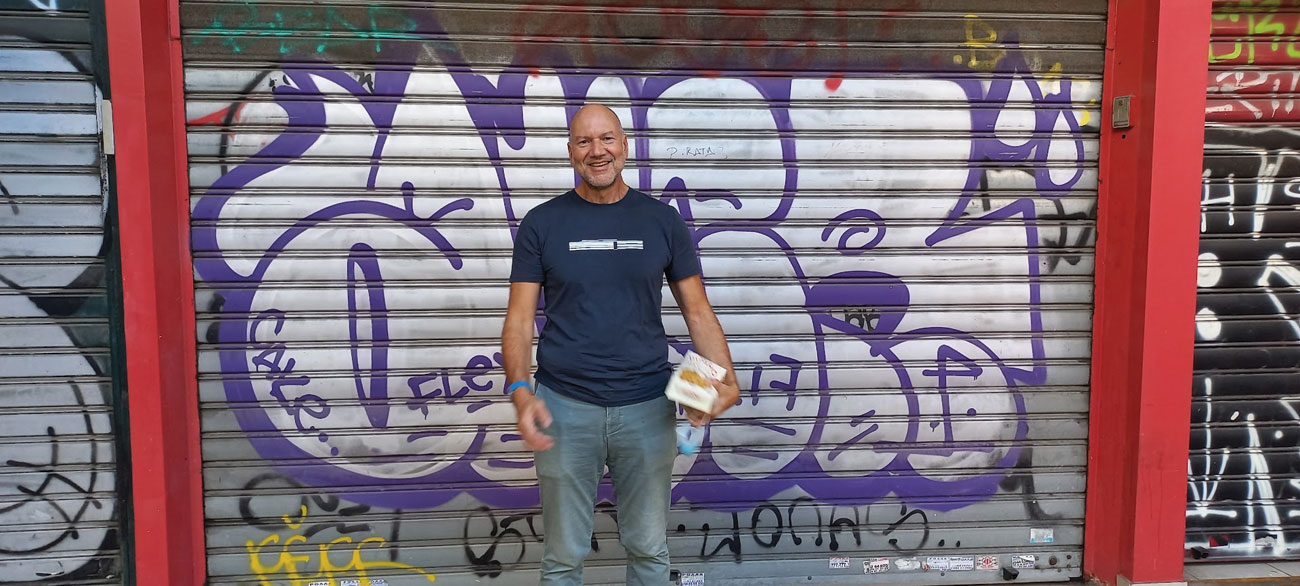 Φτάνουμε πάλι στο ύψος της Ομόνοιας, μέσω των Χαυτείων μπαίνουμε στην Αιόλου για να κάνουμε όμως μια μικρή παράκαμψη στην Ευριπίδου. Μου δείχνει το μαγαζί που κάποτε στέγαζε το κατάστημα του παππού του, ξετυλίγονται οι μνήμες. Του ζητάω να τον φωτογραφίσω εκεί και δέχεται με γεμάτο χαμόγελο. «Δεν μπορείς να χαρείς την πόλη όταν είναι άδεια, τελικά αυτό που θες είναι η ζωή της πόλης», μου λέει λίγο πριν τον χαιρετίσω και ανανεώνουμε το ραντεβού μας σε 2 χρόνια από τώρα για να καταγράψουμε την αλλαγή που έχει προβλέψει.