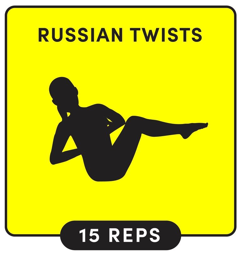 Είσαι σε καθιστή θέση κάνοντας κοιλιακούς χωρίς να αφήσεις τα πόδια σου να αγγίξουν το έδαφος. Αν θέλεις σκέψου ότι το έδαφος είναι λάβα. Συνέχισε για 15 επαναλήψεις.