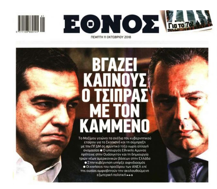 Βγάζει καπνούς ο Τσίπρας με τον Καμμένο είναι ο σημερινός τίτλος του «Έθνους», ενώ η «Εφημερίδα των Συντακτών» επιλέγει για πρωτοσέλιδο τίτλο: Ο Π. Καμμένος βλάπτει σοβαρά τη χώρα.