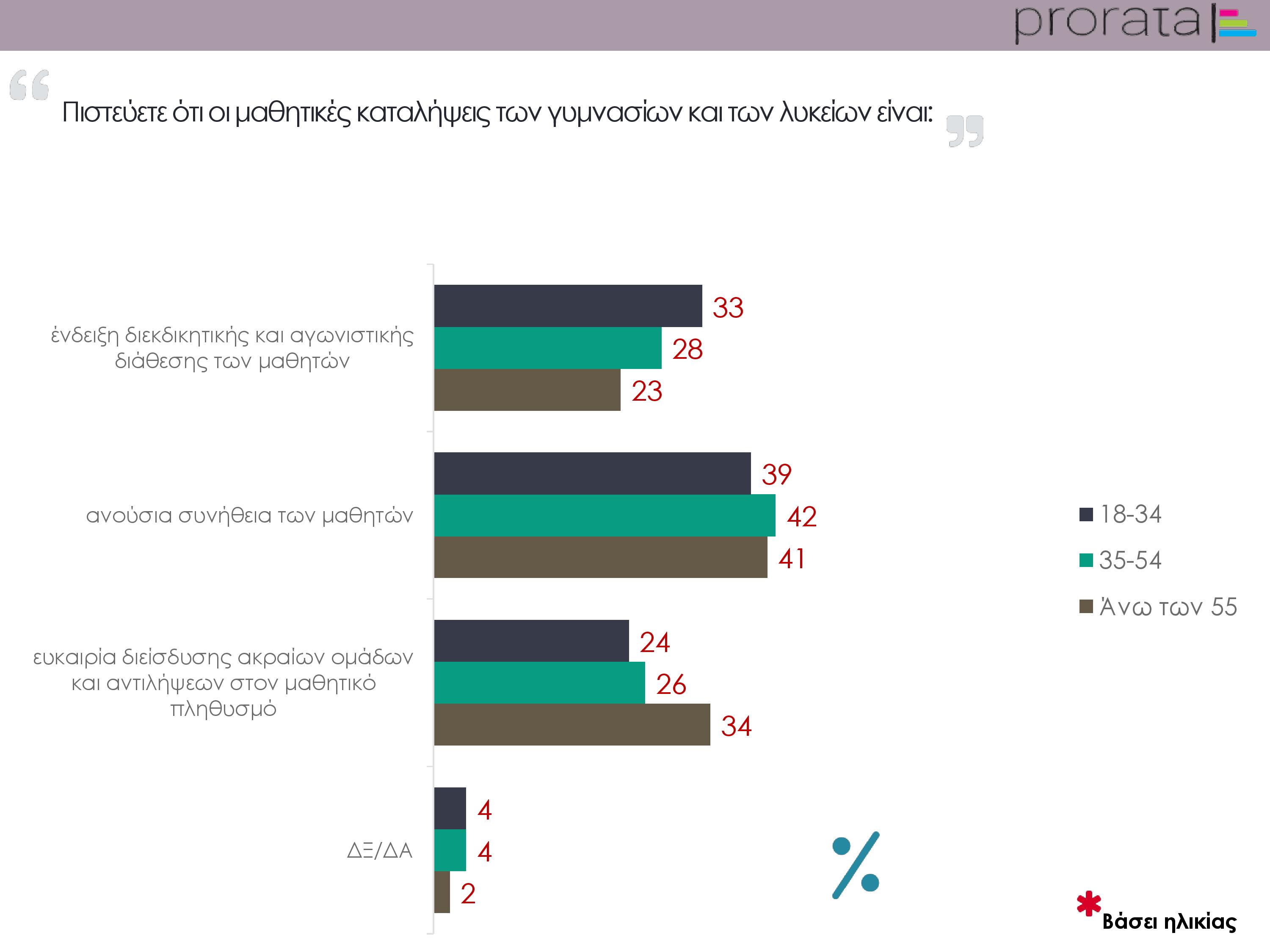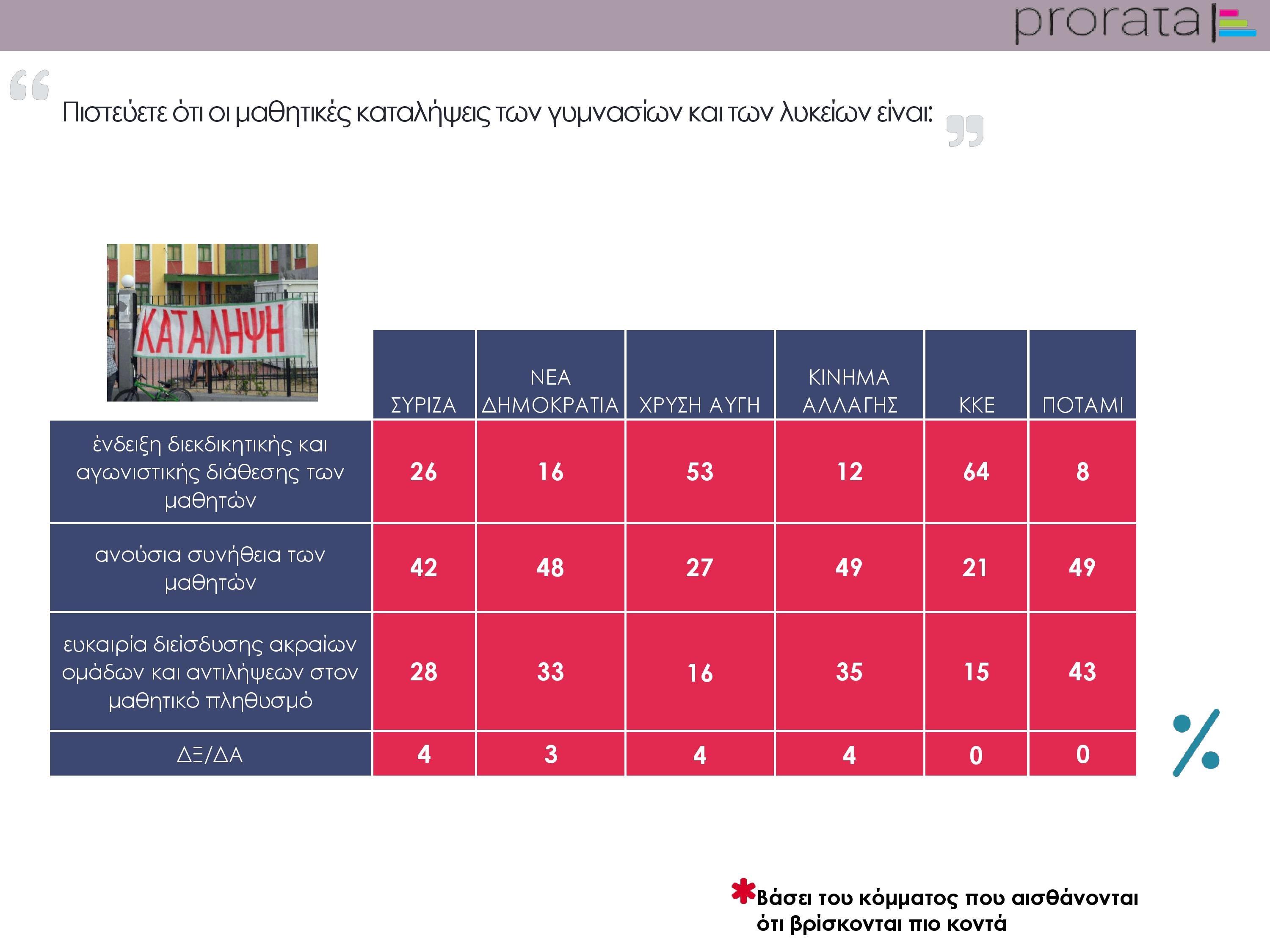 Η Ερώτηση της Εβδομάδας από την Prorata έθεσε το συγκεκριμένο ζήτημα και κατέγραψε μια υπεροχή της άποψης ότι οι μαθητικές καταλήψεις αποτελούν μια ανούσια συνήθεια (41%) έναντι της άποψης ότι είναι μια ένδειξη της αγωνιστικής και διεκδικητικής διάθεσης των μαθητών (27%). Ωστόσο, ενδιαφέρον παρουσιάζει το υψηλό ποσοστό που κατέγραψε η άποψη ότι οι καταλήψεις είναι μια ευκαιρία διείσδυσης ακραίων ομάδων και αντιλήψεων στον μαθητικό πληθυσμό (28%), εύρημα που μαρτυρά ότι οι καταλήψεις προσλαμβάνονται από μέρους του πληθυσμού ως «δούρειος ίππος» για σημαντικότερες της φαινομενικής τους πολιτικές ζυμώσεις. Η σύνδεση των καταλήψεων με τη μαθητική εξέγερση του 2008 επ’ αφορμή της δολοφονίας Γρηγορόπουλου, αλλά και με την οργανωμένη προσπάθεια υποκίνησης καταλήψεων σε σχολεία της Βόρειας Ελλάδας κατά τις τελευταίες ημέρες με πρόσχημα την υπό συζήτηση συμφωνία για το όνομα της ΠΓΔΜ ή τη δολοφονία Κατσίφα στην Αλβανία ερμηνεύει το σημαντικό ποσοστό που συγκεντρώνει η άποψη αυτήν, ειδικά στη συγκεκριμένη χρονική στιγμή.