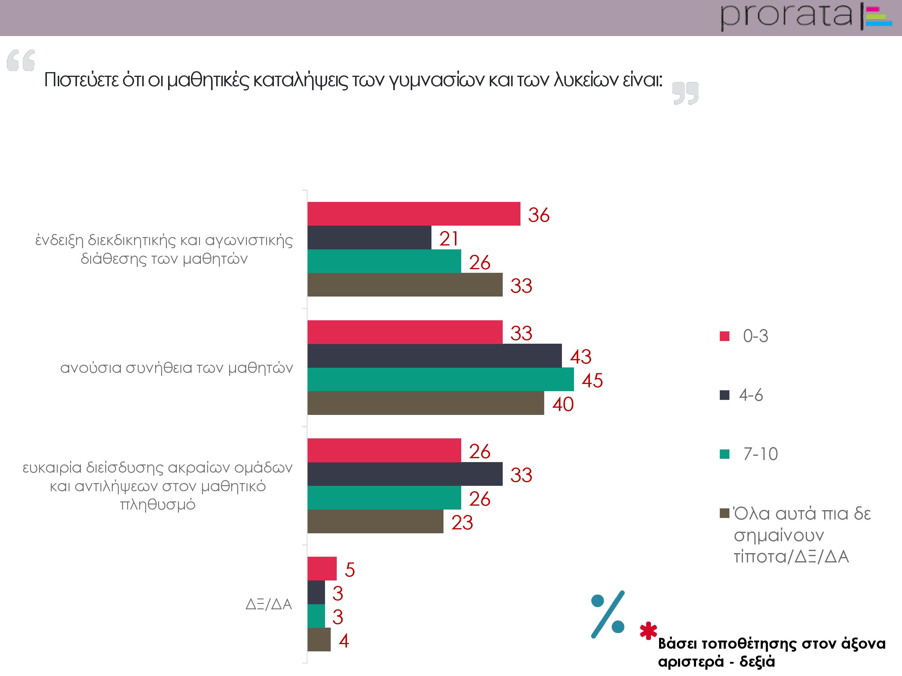 Οι συσχετίσεις είναι δικαιολογημένες, αν σκεφτεί κανείς ότι τα δύο πρώτα κόμματα ενθαρρύνουν –προφανώς το καθένα από μια διαφορετική αφετηρία– την ενεργητική διεκδίκηση, ενώ το τρίτο κόμμα αποθαρρύνει την ένταση που συνεπάγεται η διεκδίκηση της μίας ή της άλλης κοινωνικής ομάδας προς όφελος μιας κοινά αποδεκτής συναινετικής διαδικασίας. Τελικά, οι στάσεις έναντι των σχολικών καταλήψεων αναδεικνύουν, πέρα από τις πεποιθήσεις για το αν οι μαθητές διεκδικούν με αιτία ή χωρίς, μια ενδιαφέρουσα αντίθεση για την πρόσληψη της πολιτικής ως έναν χώρο σύγκρουσης, σύνθεσης ή απλώς συνεύρεσης.