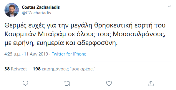Το tweet του βουλευτή το οποίο φαίνεται στην επίμαχη φωτογραφία, στη κάτω δεξιά γωνία, είναι πραγματικό και εκεί ο ίδιος εύχεται καλό Μπαϊράμι σε όλους τους Μουσουλμάνους. [πηγή]