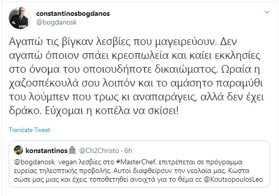 «Αγαπώ τις vegan λεσβίες που μαγειρεύουν» απάντησε σε ρατσιστικό tweet για το MasterChef ο Κωνσταντίνος Μπογδάνος.