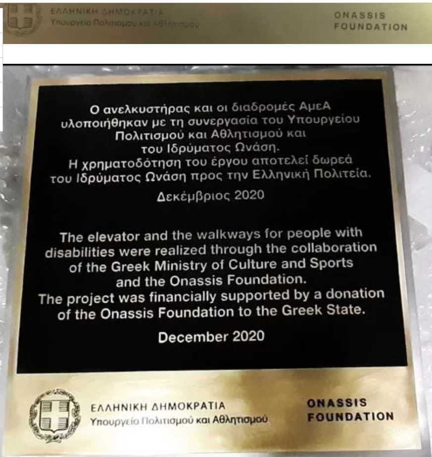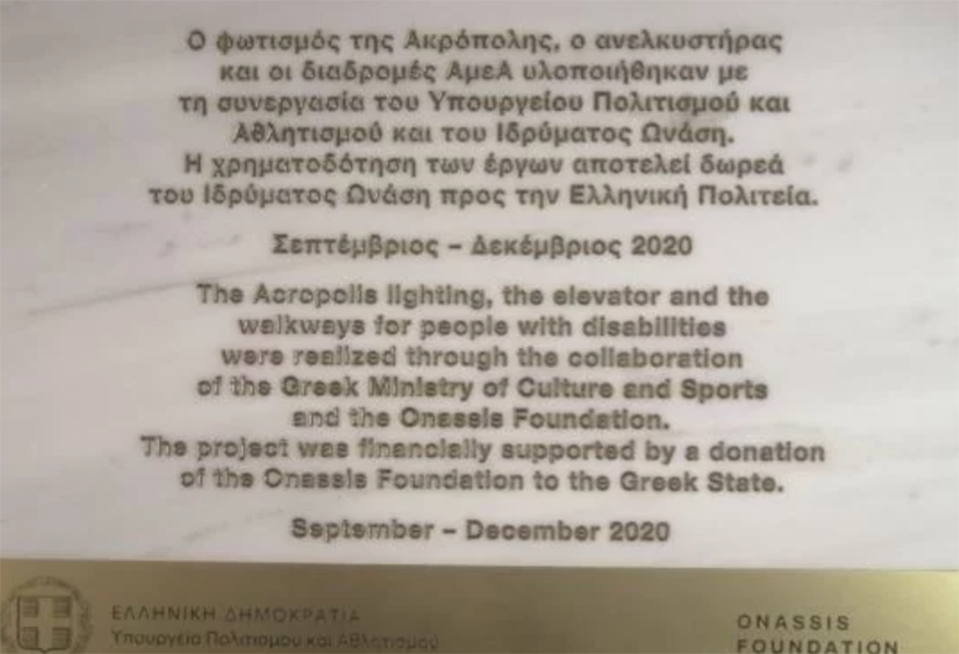 «Αυτή που έχει ξεπεράσει κάθε όριο είναι η, κατ' ευφημισμό πλέον Υπουργός Πολιτισμού, κυρία Μενδώνη. Η ίδια, από κοινού με τον Υπουργό και τον Υφυπουργό Οικονομικών στις 28.02.2020 υπέγραψε την αμφιλεγόμενη «σύμβαση δωρεάς» με το Ίδρυμα Ωνάση που με ένα χρόνο καθυστέρηση κατέθεσε στη Βουλή μετά από επίμονα αιτήματα της Αξιωματικής Αντιπολίτευσης. Στη σύμβαση αυτή, που η ίδια κατέθεσε και υπέγραψε, στο άρθρο 9 αναφέρεται: Το Δημόσιο συμφωνεί ότι στην αρχή και την απόληξη της πλατφόρμας του Ανελκυστήρα Πλαγιάς και στην είσοδο των Προπυλαίων της Ακρόπολης δίπλα από την σχετική επιγραφή που αφορά την χορηγία της Ε.Ε και του Ινστιτούτου Θερβάντες, θα μπει ειδική μαρμάρινη επιγραφή διαστάσεων ίσων προς τις δύο προαναφερόμενες (άλλως τουλάχιστον 70 x 40 εκ.) που θα αναφέρει: «Ο Ανελκυστήρας Πλαγιάς και ο Φωτισμός της Ακροπόλεως πραγματοποιήθηκαν με αποκλειστική χορηγία του Ιδρύματος Ωνάση επί Υπουργού Πολιτισμού Λίνας Μενδώνη (Ιούνιος 2020).