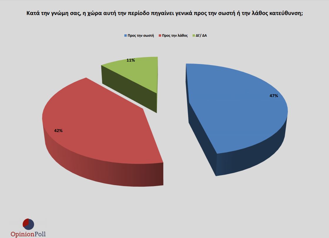 1. Κυριαρχεί έστω με μικρή διαφορά η άποψη ότι η χώρα κινείται στην σωστή κατεύθυνση. Την άποψη αυτή υιοθετεί το 47% έναντι του 42% που διατυπώνει αντίθετη άποψη. Στο τέλος Φεβρουαρίου- αρχές Μαρτίου το 50% είχε την άποψη ότι η χώρα κινείται στην λάθος κατεύθυνση. Η μείωση από 50% σε 42% είναι σημαντική αν και τροφοδότησε αυτούς που δεν απάντησαν, που ήταν επιφυλακτικοί να απαντήσουν, αλλάζοντας το ισοζύγιο.