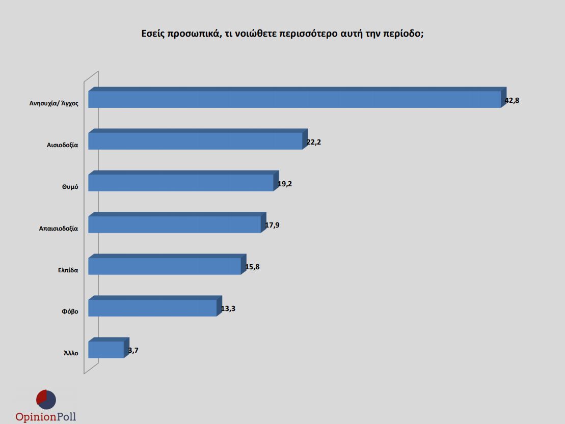 Την ίδια περίοδο κυριαρχεί η ανησυχία, το άγχος με 42.8%, ωστόσο η αισιοδοξία πρώτη φορά εμφανίζεται δεύτερη στις επιλογές με 22.2%, ενώ ακολουθούν ο θυμός με 19.2%, η απαισιοδοξία με 17.9%, η ελπίδα με 15.8% και ο φόβος με 13.3%. Οπωσδήποτε κυριαρχούν αρνητικά συναισθήματα, αλλά διαφαίνεται μια σχετικά μεγαλύτερη αισιοδοξία και ελπίδα.
