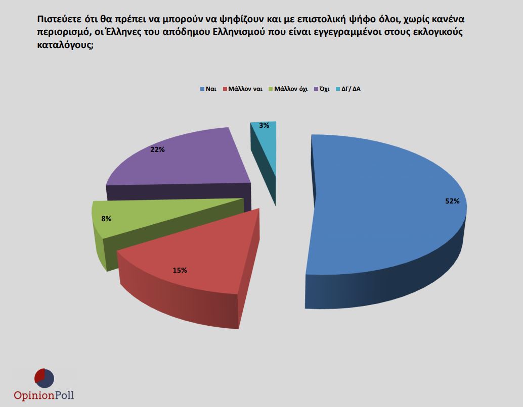 3. Για το μείζον θέμα των ψήφων των αποδήμων που είναι εγγεγραμμένοι στους εκλογικούς καταλόγους, χωρίς προϋποθέσεις ακόμα και με επιστολική ψήφο που επανήλθε στον δημόσιο διάλογο, το 67% τάσσεται υπέρ. Τα μεγαλύτερα ποσοστά βρίσκονται στην Ν.Δ με 84.8% και στο ΚΙΝΑΛ με 82.6%. Ωστόσο αυτή η άποψη είναι πλειοψηφική σ΄όλα τα κόμματα πλην του ΜΕΡΑ 25. Στο ΣΥΡΙΖΑ με 49.2% έναντι 46.7% που έχει άλλη άποψη, στο Κ.Κ.Ε το 57.1% έναντι 38.1%, στην ΕΛΛΗΝΙΚΗ ΛΥΣΗ το 68.9% έναντι 31%, στο ΜΕΡΑ 25 με 45.% έναντι 53.9%.
