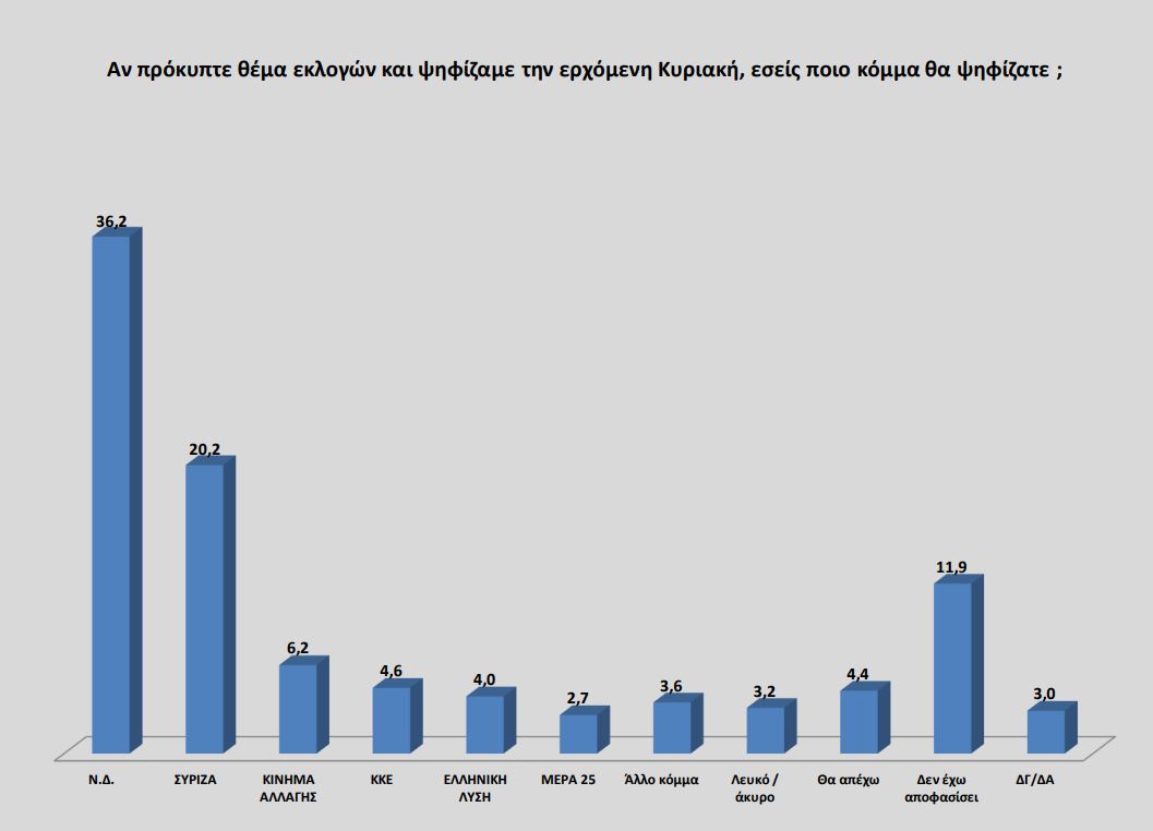Συγκεκριμένα, η Νέα Δημοκρατία καταγράφει 36,2%, ενώ ο ΣΥΡΙΖΑ 20,2%. Ακολουθούν το Κίνημα Αλλαγής με 6,2%, το ΚΚΕ με 4,6%, η Ελληνική Λύση με 4% και το ΜέΡΑ25 με 2,7%.