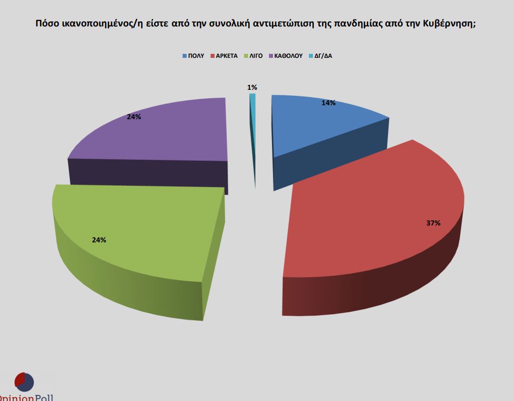 – Η ικανοποίηση από τον τρόπο διαχείρισης της πανδημίας από την Κυβέρνηση φτάνει στο 51% έναντι ενός 48% που έχει διαφορετική άποψη. Ικανοποίηση εξέφραζε το 53% ενάμιση μήνα πριν. Υπάρχει δηλαδή μια μείωση της ικανοποίησης κατά 2%. Θετική άποψη έχει το 82.5% της Ν.Δ, το 69.4% του ΚΙΝΑΛ, αλλά και το 30% του ΣΥΡΙΖΑ, το 28.8% του Κ.Κ.Ε, το 46.6% της ΕΛΛΗΝΙΚΗΣ ΛΥΣΗΣ και το 22.2% του ΜΕΡΑ 25. Τεράστια απόσταση χωρίζει την άποψη των νέων 17-35 από τους 65+. Οι πρώτοι είναι ικανοποιημένοι κατά 27.9%, ενώ οι δεύτεροι κατά 69.4%.
