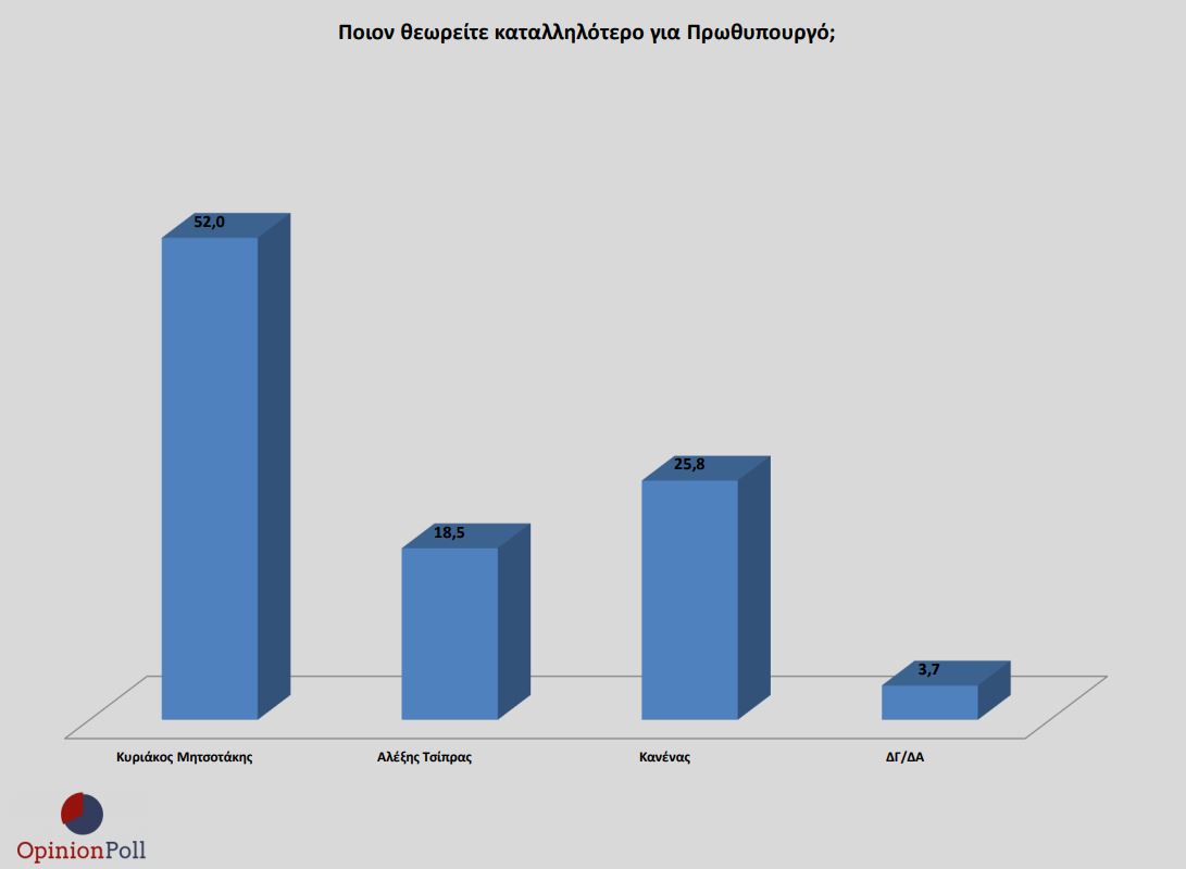 Στο ερώτημα «Ποιον θεωρείτε καταλληλότερο για πρωθυπουργό», ο Κυριάκος Μητσοτάκης καταλαμβάνει το 52% και ο Αλέξης Τσίπρας το 18,5%, με τον «Κανένα» να συγκεντρώνει 25,8%.