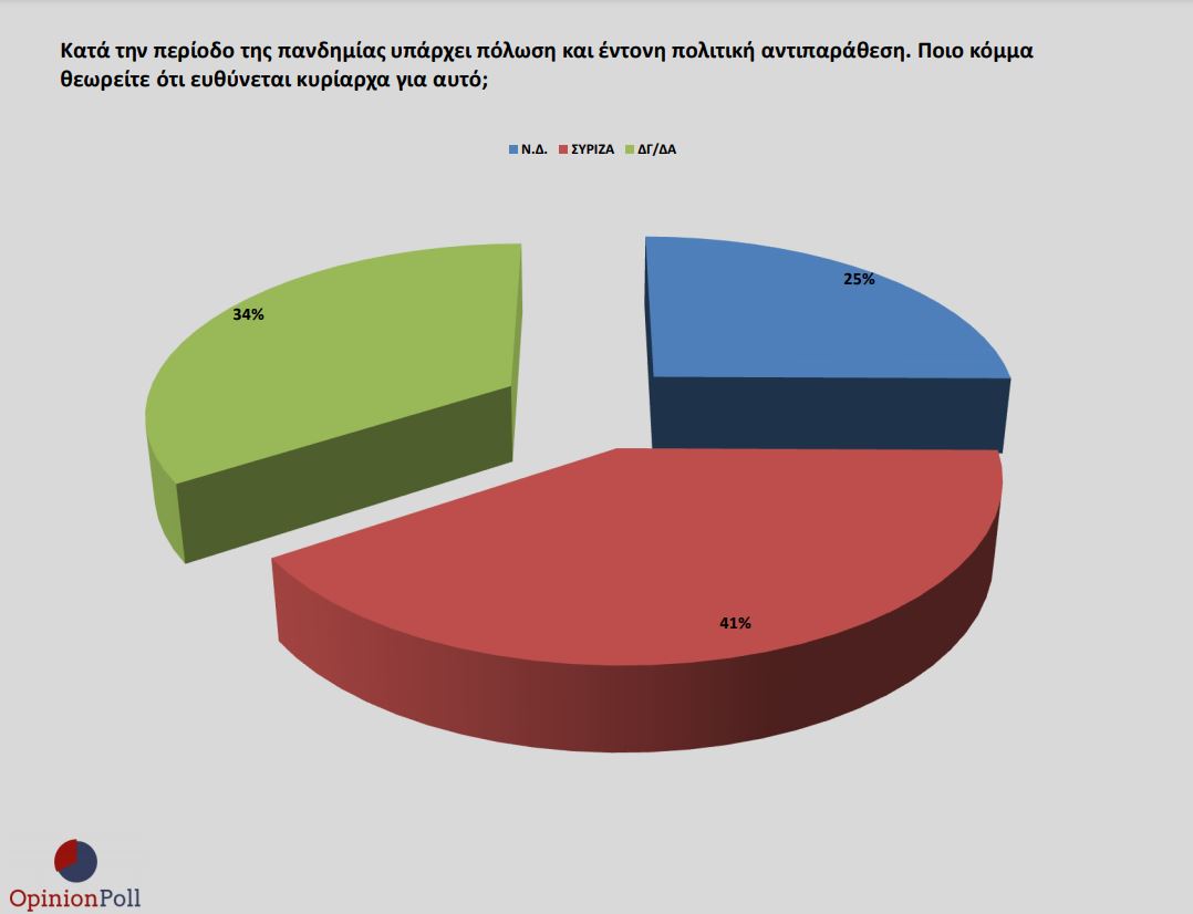 – Για την ισχυρή πόλωση που υπάρχει κατά την διάρκεια της πανδημίας, το 41% θεωρεί ότι τις βασικές ευθύνες τις έχει ο ΣΥΡΙΖΑ και το 25% η Ν.Δ με το 34% να αποφεύγει να πάρει θέση.