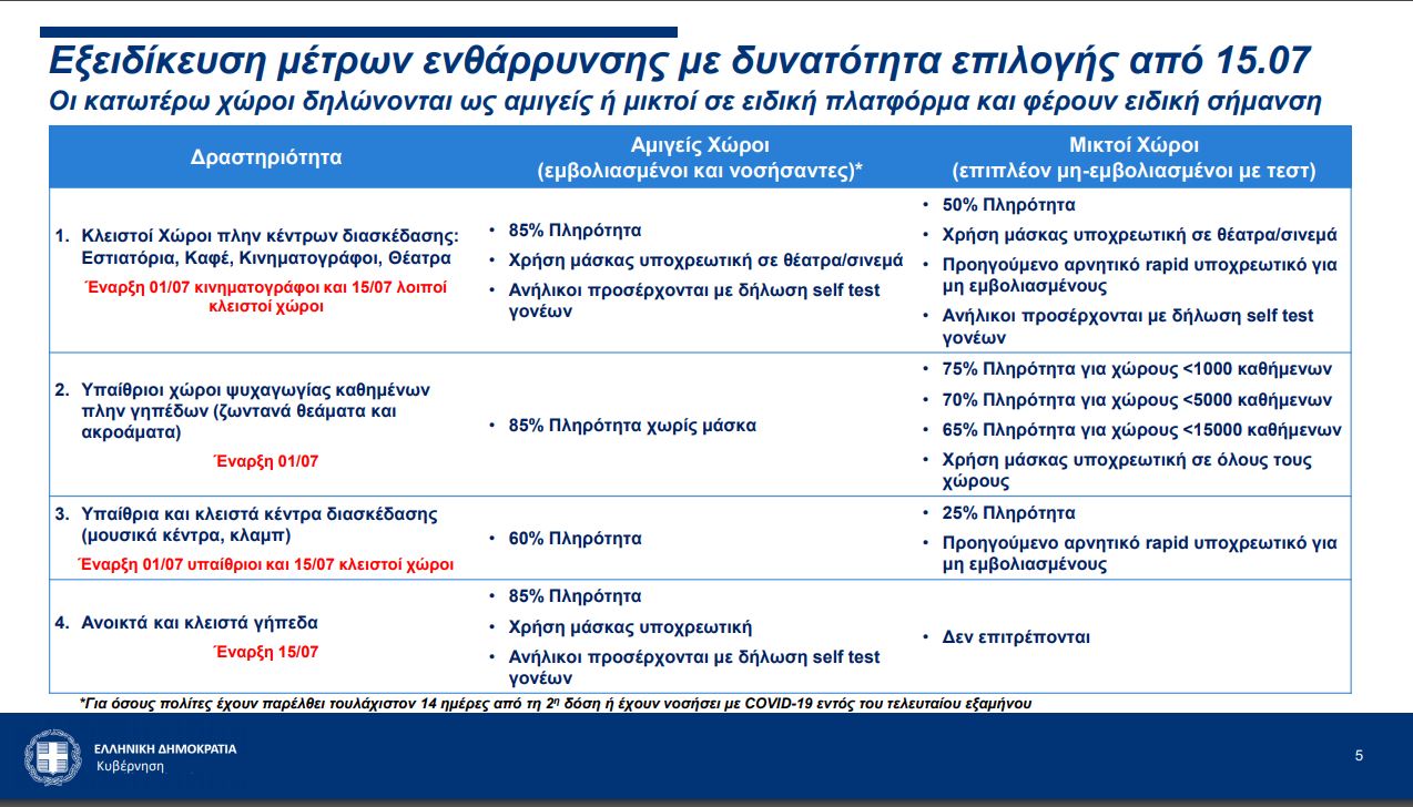 Όλοι οι χώροι συναθροίσεων που μπορούν να υποδέχονται κοινό δηλώνονται, κατ’ επιλογή, ως αμιγείς (από τις 15 Ιουλίου και μετά) ή ως μικτοί, σε ειδική πλατφόρμα, και φέρουν ειδική σήμανση στην είσοδό τους.