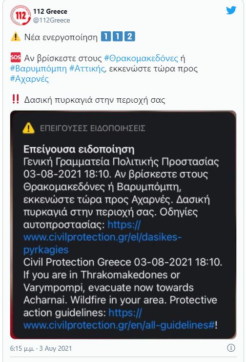 Λίγα λεπτά μετά τις 18:10 εστάλη μήνυμα από το 112 προς του πολίτες για εκκένωση των Θρακομακεδόνων, όπου φαίνεται ότι κινείται η φωτιά που έχει ξεσπάσει από το μεσημέρι (3/8) στη Βαρυμπόμπη.
