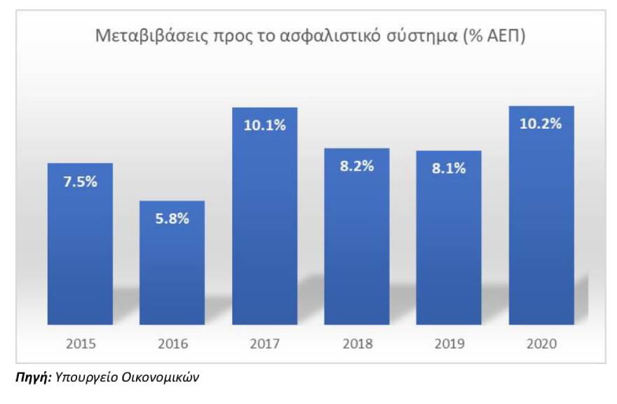 Το ασφαλιστικό σύστημά μας έχει ως βασικό αιμοδότη τον κρατικό προϋπολογισμό, αφού σχεδόν το 57% των εσόδων των ταμείων είναι κυρίως κρατικές μεταβιβάσεις από τον προϋπολογισμό (εδώ προστίθενται και οι αποδόσεις και η ρευστοποίηση περιουσιακών στοιχείων).Τα ασφαλιστικά ταμεία στηρίζονται περισσότερο στην κρατική χρηματοδότηση και λιγότερο στις ασφαλιστικές εισφορές, ενώ θα έπρεπε να συμβαίνει το αντίθετο.