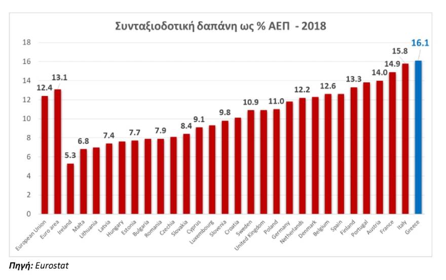 Στην Ελλάδα, το 2018 η συνταξιοδοτική δαπάνη ήταν η υψηλότερη ανάμεσα στις χώρες της ΕΕ και ανερχόταν στο 16,1% του ΑΕΠ.