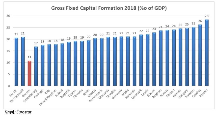 Παράλληλα, έχουμε τον χειρότερο δείκτη επενδύσεων προς ΑΕΠ στην Ευρώπη. Μόλις το 11% του ΑΕΠ της Ελλάδας δαπανάται σε επενδύσεις. Το υπόλοιπο 89% είναι κατανάλωση. Αποτελέσματα αυτού, η χαμηλή δυναμική της ελληνικής οικονομίας και οι χαμηλοί ρυθμοί ανάπτυξης.