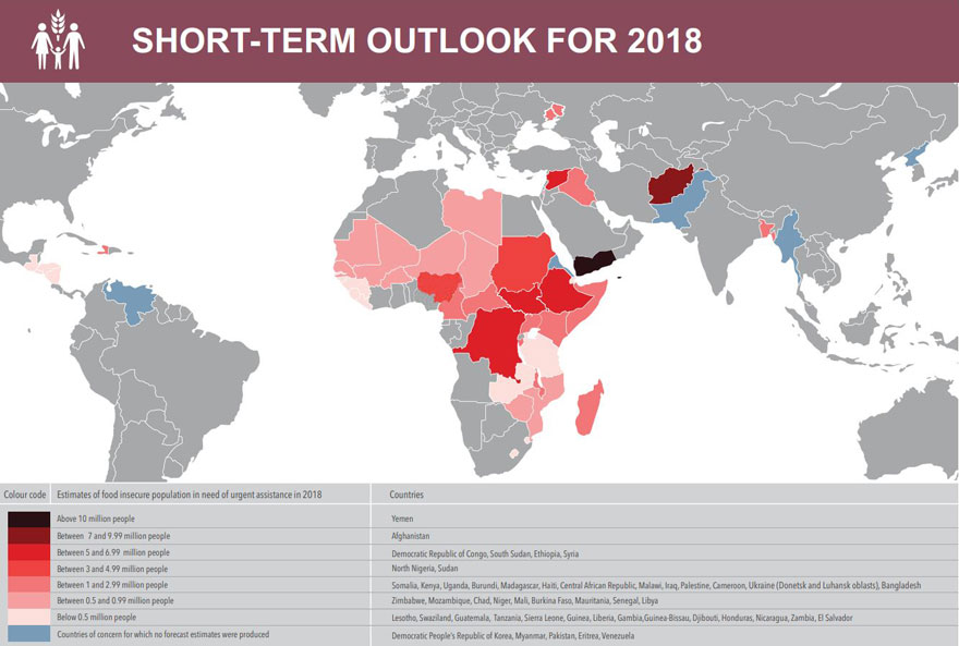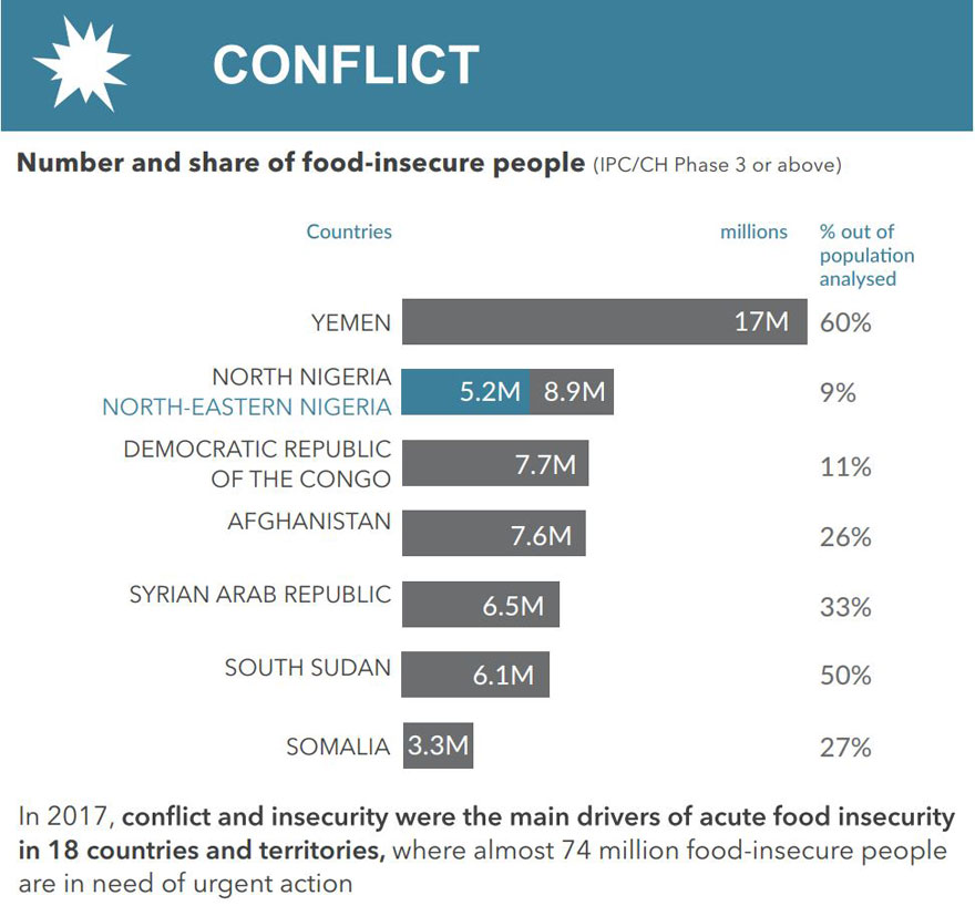 Οι εντεινόμενες και παρατεταμένες συγκρούσεις σε χώρες όπως η Υεμένη, η Βόρεια Νιγηρία, η Λαϊκή Δημοκρατία του Κονγκό, το Νότιο Σουδάν και η Μυανμάρ, κληροδότησαν τις χειρότερες επισιτιστικές κρίσεις το 2017. Στην Υεμένη 17 εκατομμύρια άνθρωποι (περίπου το 60% του πληθυσμού) επλήγησαν από την πείνα, στη Συρία 6,5 εκατομμύρια και 1,6 εκατομμύρια άνθρωποι στην Παλαιστίνη.