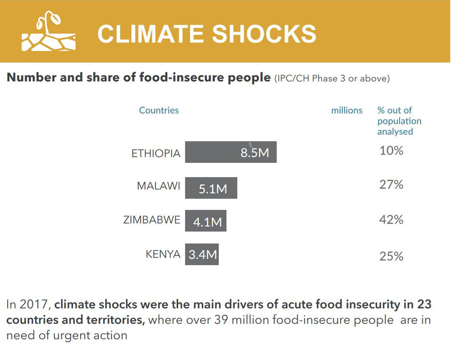 Για κλιματικούς λόγους, με κυρίαρχη την ξηρασία, 39 εκατομμύρια άνθρωποι σε 23 χώρες βρίσκονται αντιμέτωποι με οξεία πείνα. Δεκαπέντε από αυτές τις χώρες βρίσκονται στην Αφρική με 32 εκατομμύρια ανθρώπους να χρήζουν άμεσης βοήθειας. Πέντε χώρες βρίσκονται στη Λατινική Αμερική και την Καραϊβική (με 3,3 εκατομμύρια άτομα) και τρεις στη Νότια Ασία (με 4,4 εκατομμύρια άτομα). Οι χώρες που είναι επιρρεπείς σε ξηρασία, κυκλώνες, τυφώνες και πλημμύρες τείνουν να έχουν διαδοχικές χαμηλές συγκομιδές, επειδή τα φτωχά αγροτικά νοικοκυριά έχουν περιορισμένη πρόσβαση σε λιπάσματα και άλλα εργαλεία βελτίωσης της παραγωγής τους. Η μειωμένη παραγωγή έχει ως αποτέλεσμα την αύξηση των τιμών. Η αδυναμία των φτωχών νοικοκυριών σε χώρες όπως η Νιγηρία, η Αιθιοπία, η Ουγκάντα, η Υεμένη και το Σουδάν να ανταποκριθούν σε αυτή την άνοδο των τιμών οδηγεί σε συνθήκες ανέχειας και πείνας.
