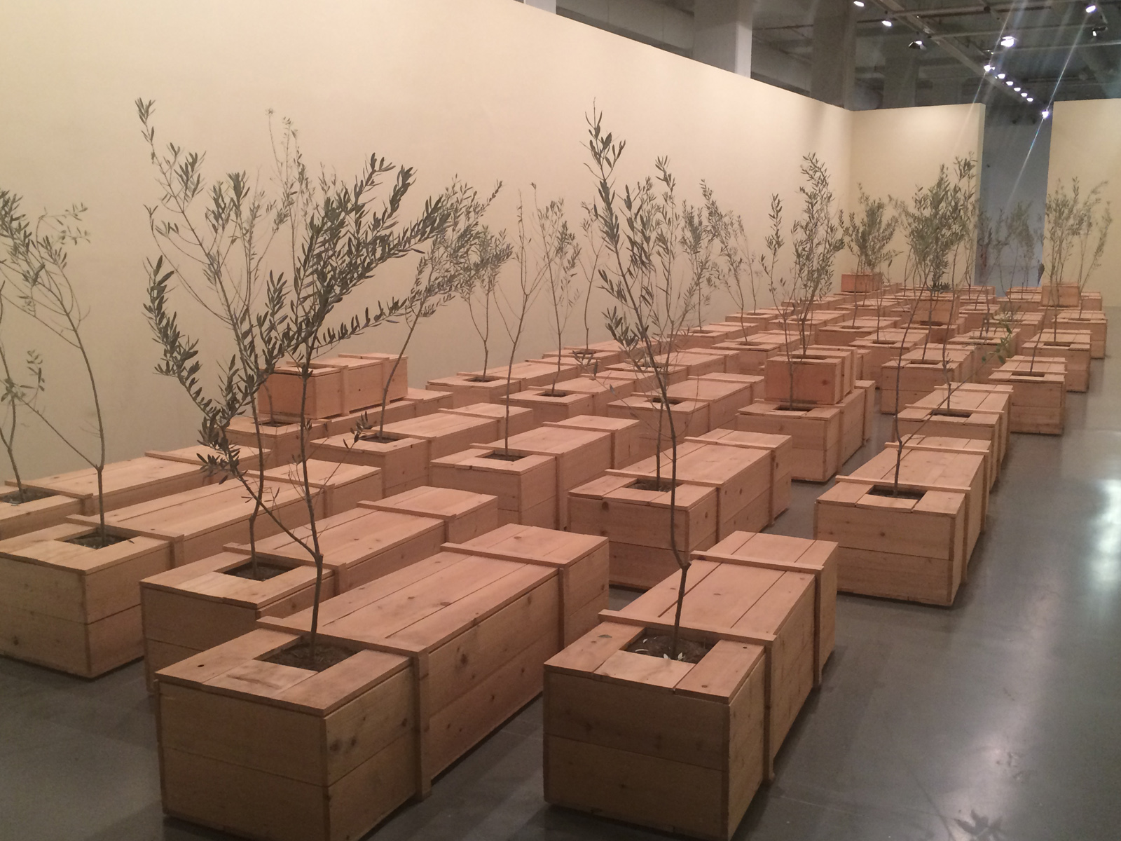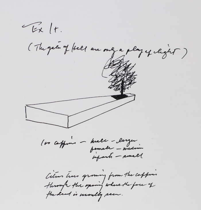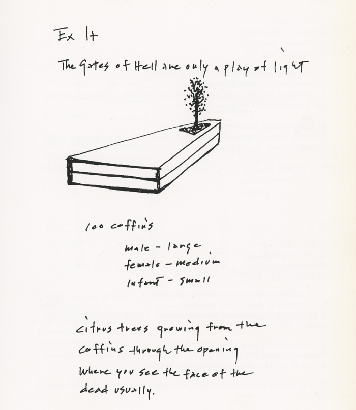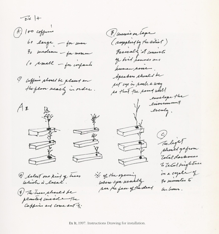 «Κοφίνια από κοντραπλακέ. Εκατό. Σε ίση απόσταση το ένα από το άλλο. Από μέσα τους γεννιούνται, αναφύονται δέντρα. Μόνος ήχος στο χώρο το κελάηδημα των πουλιών και ίσως ο καταπραϋντικός, απαλός και χαμηλόφωνος ήχος των φύλλων που πέφτουν. Κοντράστ: ζωή και θάνατος. Γιατί ζωή είναι τα δέντρα που μεγαλώνουν και θάνατος τα βουβά φέρετρα. 60 ανδρών, 30 γυναικών, 10 μικρών παιδιών. Δεν γράφουν όνομα, ούτε ημερομηνίες. Σκέτα, καμιά ιστορία. Σαν βουβή προσευχή. Όλες μου οι δουλειές ξεκινούν από την ιδέα της προσευχής. Όλη μου η ζωή είναι μια προσευχή. Προσεύχομαι για την πρόοδο και την ειρήνη, προσεύχομαι για το μέλλον, η δουλειά μου πάντα αφορούσε το μέλλον, σαν οφθαλμαπάτη. Αν δεις το “Ex It” από μακριά, ίσως σκεφτείς ένα δάσος. Ή ένα τεράστιο ξύλο. Πλησιάζοντας κοντύτερα, όλα θα ξεκαθαρίσουν. Ανανέωση, μετενσάρκωση, μετεμψύχωση, γιατί αυτό εξυπηρετούν τα δέντρα. Παράγουν οξυγόνο και αέρα, πάνω τους τα πουλιά στήνουν φωλιές, κάτω στις ρίζες τους οι άνθρωποι φιλιούνται και ερωτεύονται. Είτε λόγω αέρα που φυσά είτε λόγω γήρανσης, τα φύλλα που πέφτουν είναι το λίπασμα της γης. Όπως κι εμείς όταν σβήσουμε, όταν πεθάνουμε, όλοι θαρρώ πως γινόμαστε δέντρα. Ένα με αυτά. Όταν θαφτώ θα γίνω λίπασμα κι ένα καινούργιο δέντρο. Έτσι θέλω να πιστεύω πως θα ζήσουμε για πάντα, θα ερχόμαστε, θα φεύγουμε και θα ξαναρχόμαστε. Μια υπέρτατη τιμή είναι όλο αυτό, μια επ’ άπειρο επιστροφή στο επίνειό μας». -Υοkο Οnο