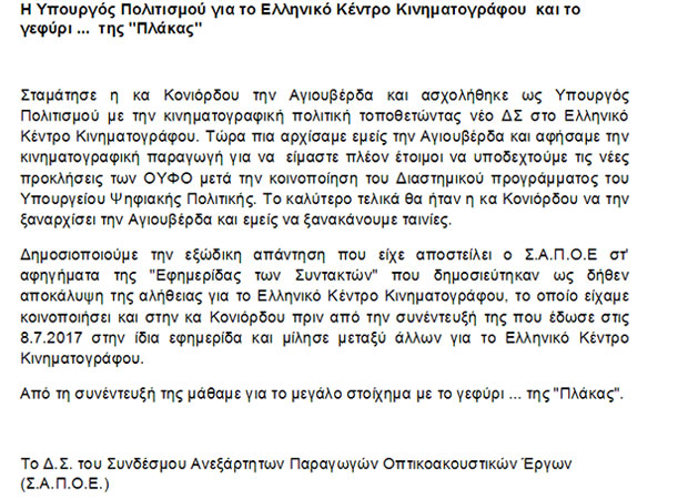 Απάντηση στις δηλώσεις της υπουργού Πολιτισμού Λυδίας Κονιόρδου στην «Εφημερίδα των Συντακτών» για το Ελληνικό Κέντρο Κινηματογράφου εξέδωσε ο Σύνδεσμος Ανεξάρτητων Παραγωγών Οπτικοακουστικών Έργων (Σ.Α.Π.Ο.Ε.).