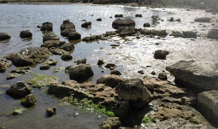 Εικ. Σαλαμίς, Όρμος Αμπελακίου. Καταβυθισμένος τετράγωνος πύργος στην δυτική πλευρά του Όρμου: μέρος του οχυρωματικού συστήματος του λιμένος της Κλασικής-Ελληνιστικής Σαλαμίνος (φωτογραφία: Γ. Λώλος).