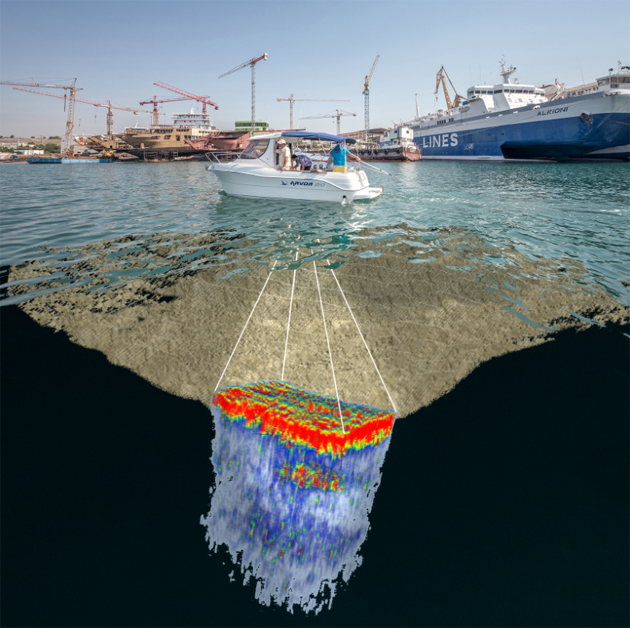 Σαλαμίς, Όρμος Αμπελακίου. Τρισδιάστατη αναπαράσταση του εντοπισμού ενός στόχου θαμμένου κάτω από τον πυθμένα του Όρμου (φωτογραφία Π. Καρατζάς, σύνθεση Ν. Γεωργίου).