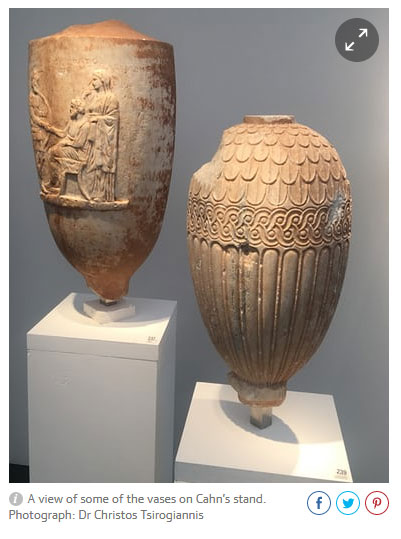 Όπως γράφει η βρετανική εφημερίδα Guardian, επικαλούμενη τις γνώσεις αλλά και τα φωτογραφικά ντοκουμέντα του Δρα Χρήστου Τσιρογιάννη, αρχαιολόγου και συμβούλου του διεθνούς Συνδέσμου Ερευνών Εγκλημάτων κατά της Τέχνης (Arca), τα δύο αρχαιοελληνικά αγγεία διατίθεντο προς πώληση στην έκθεση Frieze Masters του Λονδίνου που διοργανώθηκε πριν από λίγες ημέρες.