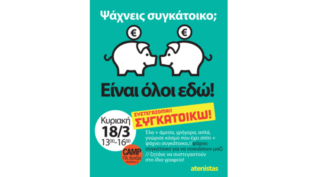 Αν ψάχνεις συγκάτοικο η συνεργάτη για να συστεγαστείτε, αν θες να νοικιάσεις σπίτι με κάποιον ή να βρεις κάποιον να μείνει στο δεύτερο δωμάτιο του σπιτιού σου, πήγαινε την Κυριακή 18 Μαρτίου 2012 στις 13.00 στο CAMP! (Απέλλου 2, 1ος ορ., ακριβώς πάνω στην Πλατεία Κοτζιά). Εκεί θα συναντήσεις άλλους Αθηναίους που ψάχνουν ακριβώς το ίδιο!