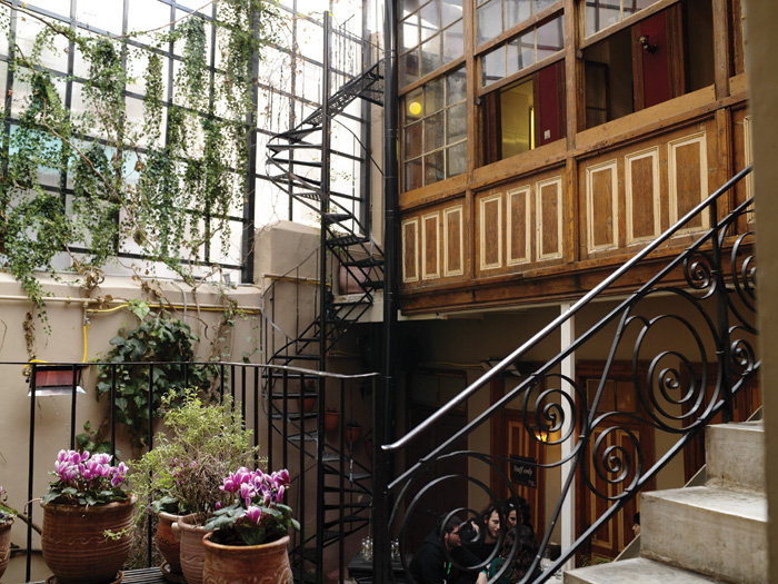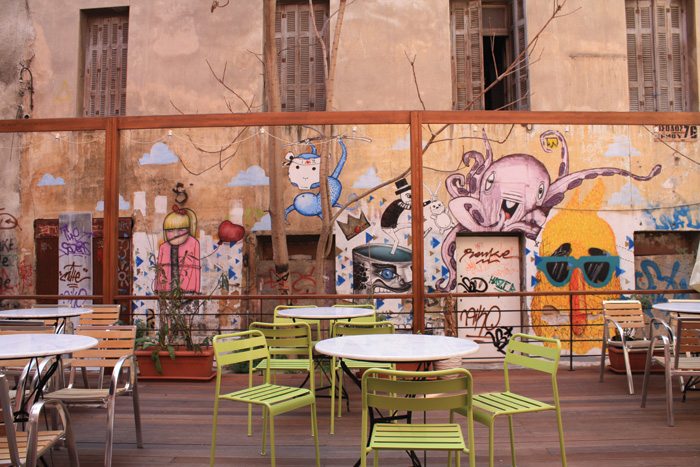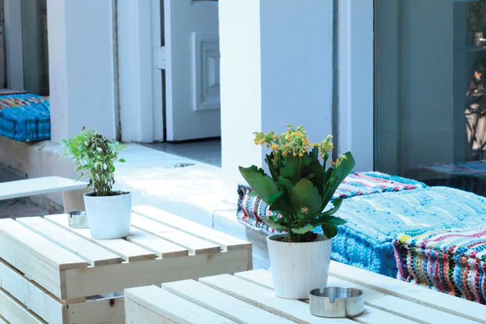 Απέναντι: Art bar Poems & Crimes, το καινούργιο μπαρ ρεστό του βιβλιοπωλείου των εκδόσεων Γαβριηλίδη κρύβει στην πίσω του μεριά ένα μυστικό: την αυλή του με τα δέντρα, το υπερυψωμένο ντεκ με τις όμορφες ντιζάιν καρέκλες, γκράφιτι από τα γύρω κτίρια. Ιδανική για ποτό και μουσική (jazz ή και ρεμπέτικο) τις ανοιξιάτικες μέρες. (Αγ. Ειρήνης 17)