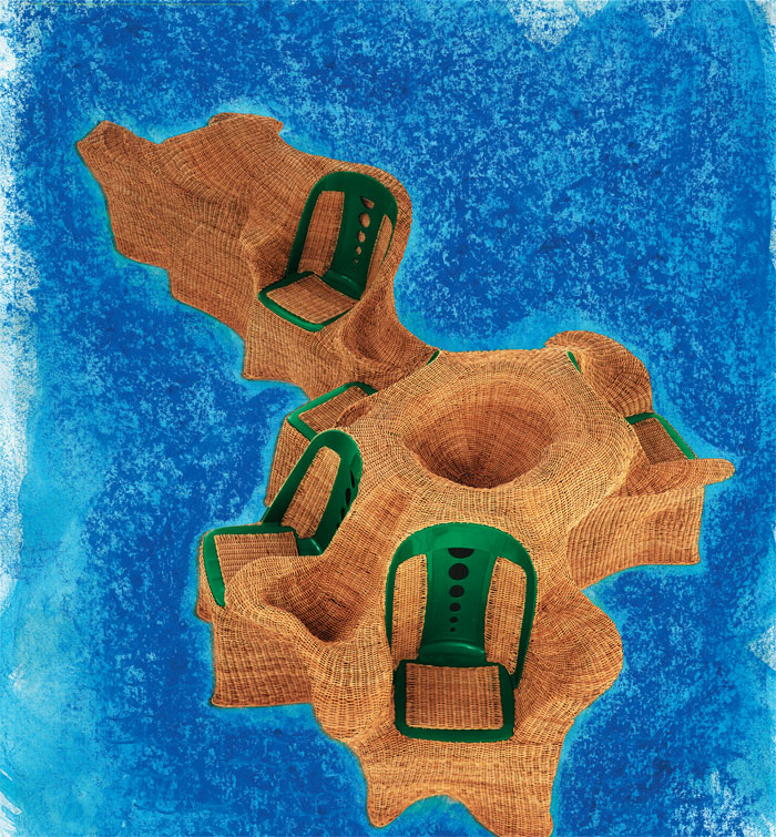 Σχεδιάζει ξανά από την αρχή τη διάσημη Transrock Chair, τη μεταμορφώνει σε νησί των Κυκλάδων και την αφιερώνει εξαιρετικά στο HOME.
