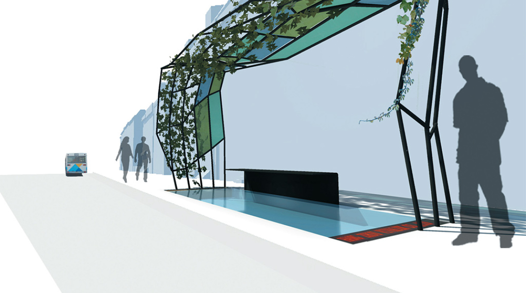 Η κατασκευή επενδύεται με τζάμια σε αποχρώσεις του πράσινου και μπλε και ευνοεί τα αναρριχώμενα φυτά που περιπλέκονται στα «κλαδιά» της δημιουργώντας ένα στεγασμένο δροσερό και πράσινο χώρο, κάτι μεταξύ πέργκολας και βιτρό. Η πόλη γεμίζει με περισσότερο πράσινο και το βράδυ οι στάσεις γίνονται σημεία φωτισμού της πόλης. Συνεργάτης: Οδυσσέας Διακάκης