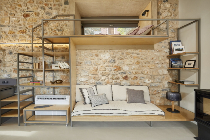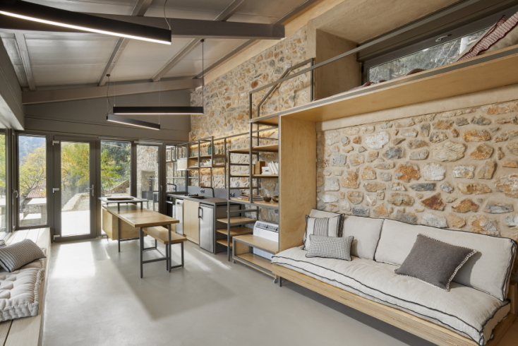 Στο εσωτερικό της πέτρινης πλευράς αναπτύσσεται ένα σύστημα που εμπεριέχει τον εξοπλισμό για όλες τις χρήσεις του χώρου: κουζίνα, βιβλιοθήκη, καθιστικό, πατάρι ύπνου. Η κατασκευή επεκτείνεται και στον εξωτερικό χώρο με υπαίθρια κουζίνα, παρέχοντας έτσι την αίσθηση της συνέχειας και της ροής των χώρων. Στη γυάλινη όψη, ο ενιαίος πάγκος μπροστά από τα παράθυρα επεκτείνεται με την αντίστοιχη λογική και δημιουργεί τον υπαίθριο στεγασμένο χώρο φαγητού. Κατεβαίνοντας τρία σκαλιά διαμορφώνεται υπαίθριο καθιστικό, τριγύρω από τη φωτιά, καθώς και χώρος φαγητού κάτω από τη σκιά των δέντρων. Ο κεντρικός αυτός χώρος, μαζί με το λουτρό, απομονώνεται και αποκτά αυτονομία από την υπόλοιπη κατοικία.