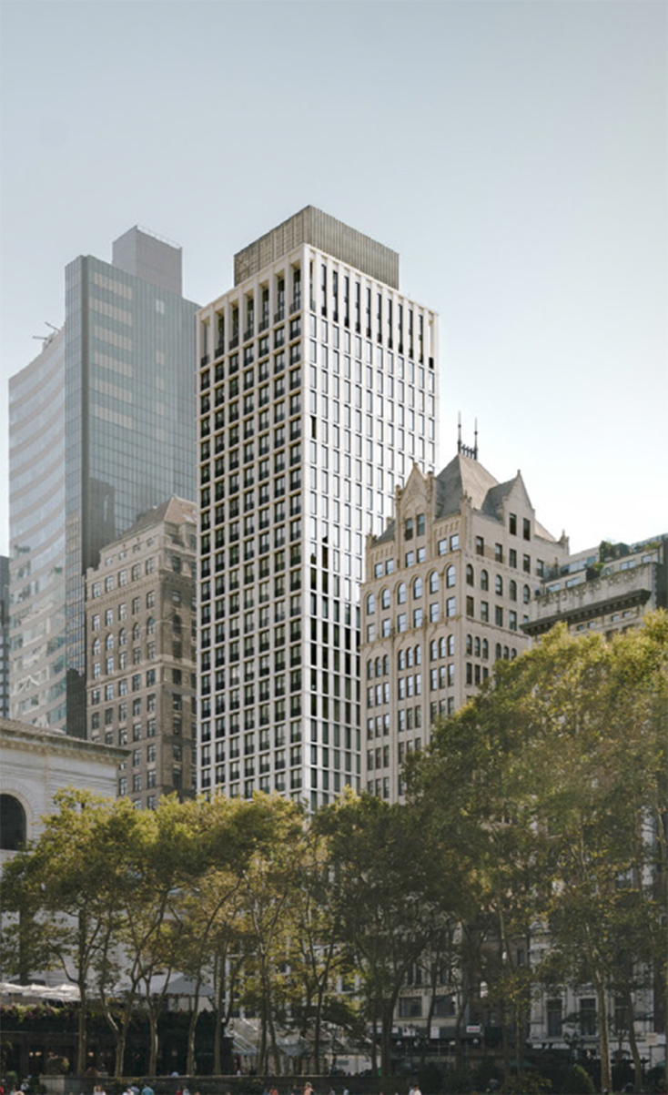 Ο καινούργιος 32όροφος ουρανοξύστης βλέπει στο πάρκο Bryant που βρίσκεται μπροστά στη Βιβλιοθήκη της Νέας Υόρκης, ένα περίφημο κτίριο ρυθμού Beaux-Arts που χτίστηκε το 1911 με τα χαρακτηριστικά λιοντάρια στον περίβολό του. Στο πάρκο συχνάζουν χρήστες της βιβλιοθήκης, ταξιδιώτες και καταναλωτές που κάνουν ψώνια στα μεγάλα καταστήματα της περιοχής, όπως το Macy’s. Τα καλοκαιρινά βράδια γίνονται υπαίθριες προβολές κλασικών αμερικανικών ταινιών, πικνίκ και συναυλίες. Από αυτόν τον μήνα, ένα καινούργιο κτίριο ρίχνει τη σκιά του στο πάρκο: έχει ύψος 123 μέτρα, στους πρώτους 14 ορόφους στεγάζει ένα ξενοδοχείο, στους υπόλοιπους 18 ιδιωτικά διαμερίσματα και μια ταράτσα με όχι και τόσο απρόσκοπτη θέα μιας και τα γειτονικά κτίρια είναι ψηλότερα. Η πρόσοψή του, σύμφωνα με τον Λονδρέζο αρχιτέκτονα David Chipperfield, αποτελεί μια «σύγχρονη ερμηνεία ενός παλιού αρχιτεκτονικού ορόσημου», με υλικό το μπετόν και με επεξεργασία που θυμίζει τον μπρουταλισμό της δεκαετίας του 1950.