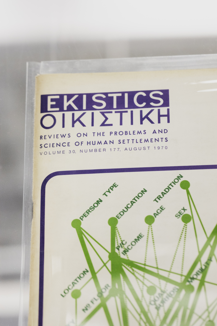 Καθώς μπαίνεις στον κυρίως εκθεσιακό χώρο, αναρτημένα σε λευκά μεταλλικά πλαίσια ξεδιπλώνονται μπροστά σου πτυχές από την καινοτόμα μελετητική πρόταση του γραφείου, που έφθασε να δραστηριοποιείται σε τέσσερις ηπείρους και 44 χώρες υπογράφοντας πρότζεκτ που καθόρισαν τις ζωές χιλιάδων ανθρώπων. Βιβλία-ημερολόγια με στοιχεία εθνογραφικού χαρακτήρα από τις πρώιμες πρακτικές τεκμηρίωσης του Δοξιάδη κατά τη δεκαετία του 1950 για πόλεις στη Συρία, τον Λίβανο, τη Ζάμπια, που καταδεικνύουν τον «πληροφοριακό μοντερνισμό» του, τον τρόπο, δηλαδή, με τον οποίο συγκεντρώνει και ταξινομεί στοιχεία για να αντιληφθεί πώς ζουν οι άνθρωποι σε κάθε περιοχή. Το περιοδικό Οικιστική, που εξέδιδε τη δεκαετία του 1960, για την κατοίκηση των ανθρώπων σε πόλεις και τους τρόπους με τους οποίους μπορούμε να τη σχεδιάσουμε. Μεταγενέστερες προτάσεις, που βασίζονταν σε δεδομένα, για την αστική ανάπτυξη της λεγόμενης Μεγαλόπολης στην περιοχή των λιμνών του Ντιτρόιτ (που περιλαμβάνουν και χάρτες για το πώς αναμενόταν να αναπτυχθούν έως το 2000 οι αστικές, μεταβατικές και αγροτικές ζώνες). Πληροφορίες για το Κέντρο Ηλεκτρονικών Υπολογιστών Δοξιάδη που συστάθηκε το 1964, «ένα αξιοθαύμαστο εγχείρημα για αρχιτεκτονικό γραφείο της εποχής».