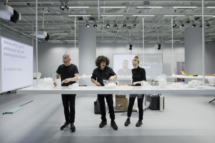 Και καθώς το σκηνικό στην περιήγηση αλλάζει, έρχεται το άλμα στο σήμερα, στην εποχή της απόλυτης κυριαρχίας της πληροφορίας και στον τρόπο που οι υπολογιστικές πρακτικές χρησιμοποιούνται για την εξάπλωση των συστημάτων ελέγχου αστικών και κρατικών συνόρων. Πάνω σ’ ένα μεγάλο τραπέζι τρισδιάστατα μοντέλα απεικονίζουν φράχτες, θερμικές κάμερες, σκάφη του λιμενικού, σημεία ελέγχου και κράτησης, τα όργανα, αντικείμενα και τους χώρους με τα οποία βρίσκονται αντιμέτωποι όσοι επιχειρούν να διασχίσουν τα σύνορα προς την Ευρώπη. Γύρω τους, σε τέσσερις οθόνες, πρόσφυγες από την Ουκρανία, τη Συρία, το Ιράν ξεδιπλώνουν τις ιστορίες τους από αυτό το πέρασμα που για κάποιους επεφύλασσε φιλόξενη υποδοχή με τσάι και κουβέρτες και για άλλους, τους περισσότερους, κράτηση, ελέγχους κι επιτήρηση. Είναι το δεύτερο επεισόδιο της έκθεσης, η «Νέα Ανθρώπινη Κοινότητα», μια κριτική αναδρομή της έρευνας του Δοξιάδη που πραγματοποιήθηκε με πρόσφατα αφιχθέντες μετανάστες και πρόσφυγες, σε συνεργασία με το Ελληνικό Συμβούλιο για τους Πρόσφυγες.