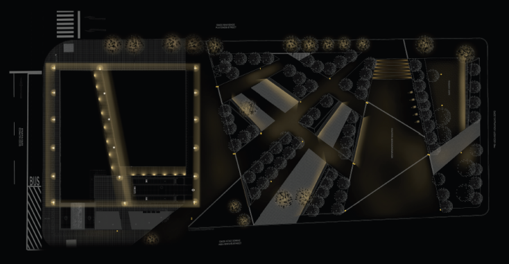 Στην πλατεία, ο λειτουργικός φωτισμός θα περιορισθεί στις οδεύσεις, σε προτομές και σε συγκεκριμένα στοιχεία της φύτευσης, οριοθετώντας έτσι τον χώρο.