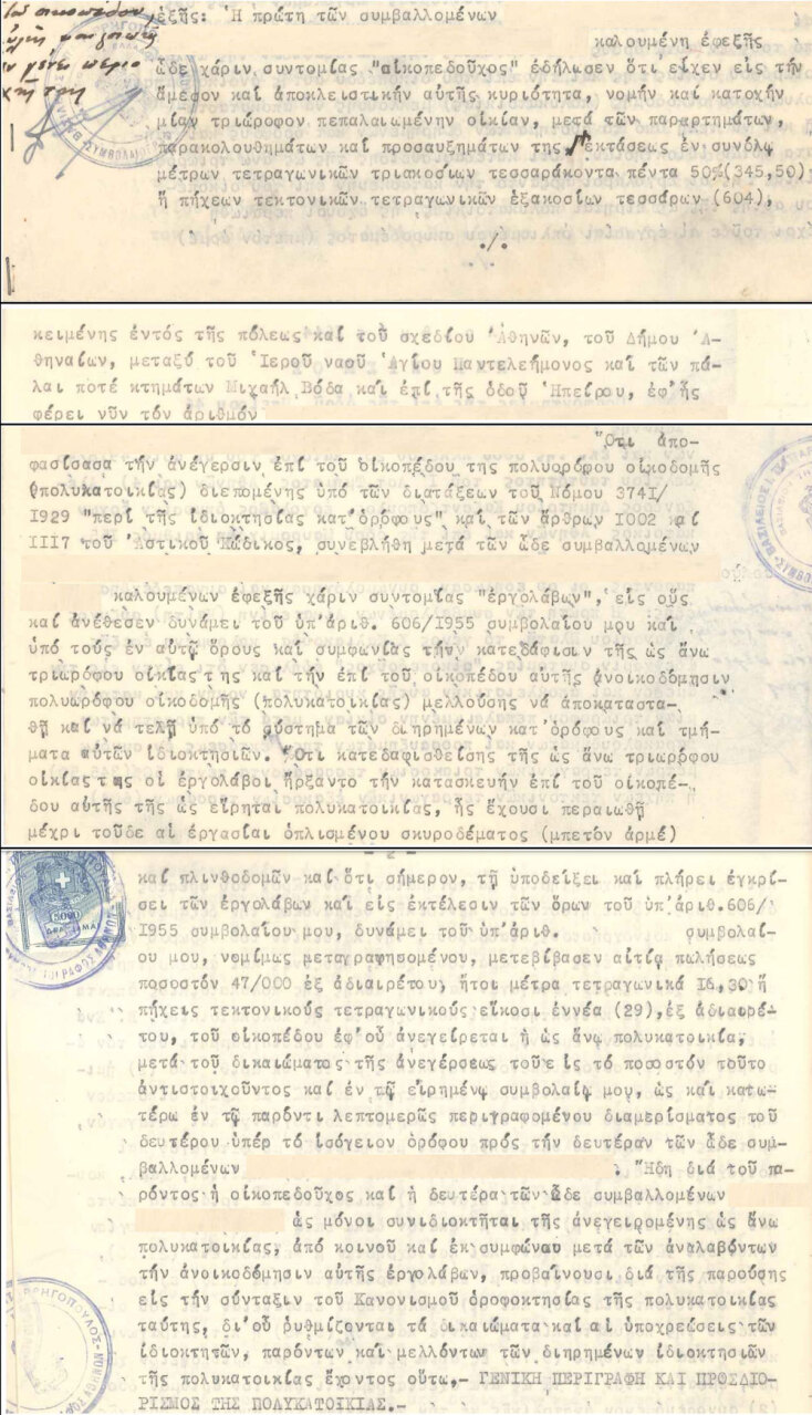 Και υπήρχαν και στρατηγικές που κινούσαν αυτούς τους δύο μικρούς παίκτες: δηλαδή τον μικρο-οικοπεδούχο και τον μικρο-εργολάβο που έκαναν αυτή τη διαδικασία. Στάνταρ σχέδια, ίδια υλικά… και ίδιες, λίγο πολύ, στρατηγικές για τα ίδια σχέδια για το πώς θα εκμεταλλευτώ αυτή τη διαδικασία ώστε να στεγαστώ και να βγάλω και κάποια χρήματα, να δημιουργήσω μια περιουσία.