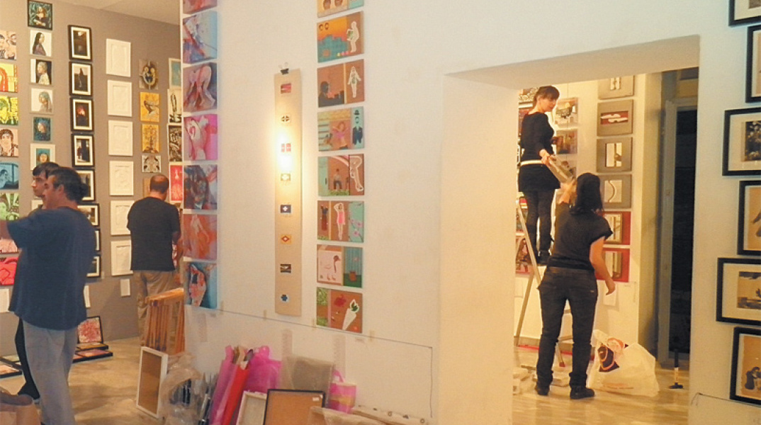 Χτυπάω το κουδούνι στον πρώτο και από το τζάμι βλέπω στο τραπέζι της εισόδου μια μισοφαγωμένη τούρτα δίπλα σε ένα τρυπάνι. Σε 2 δευτερόλεπτα η εικόνα που θα αντικρίζω θα συμπεριλαμβάνει ακόμα σκάλες, σφυριά, καρφιά και καμιά δεκαριά νέους καλλιτέχνες να επιμελούνται τον εαυτό τους στην πολύ συγκεκριμένη λωρίδα τοίχου που τους δίνεται για να κρεμάσουν τα έργα τους.