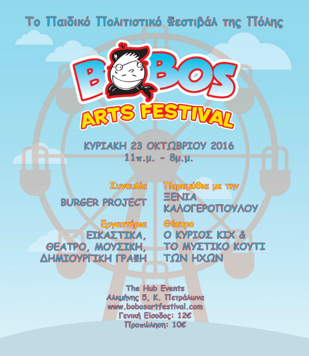Info: Bobos Arts Festival, Κυριακή 23 Οκτωβρίου, 11 – 8 (οι πόρτες ανοίγουν στις 10.30 πμ), The Hub Events, Αλκμήνης 5, Κάτω Πετράλωνα, Στάση μετρό: Κεραμικός, 210 3411009, 10€-12€, για παιδιά έως 3 ετών η είσοδος είναι δωρεάν