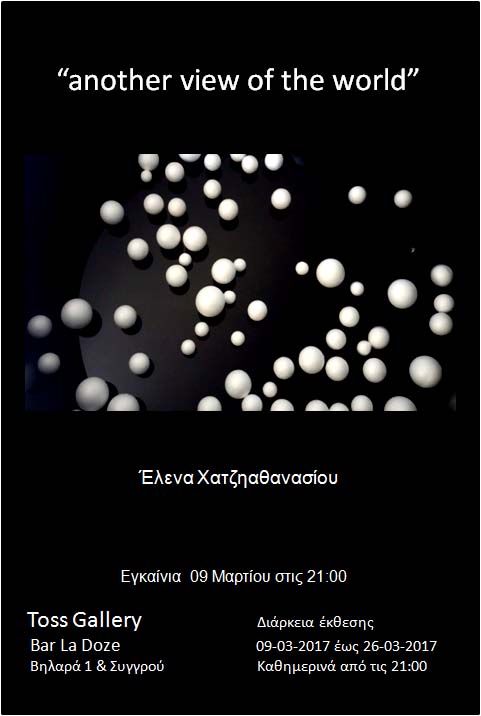 Another View Of The World: Από 9 έως και 26 Μαρτίου στην αίθουσα τέχνης TOSS (bar La dose), Βιλαρά 1 & Συγγρού. Επιμέλεια έκθεσης: Μαγδαληνή Σίγα (σκηνογράφος, γλύπτρια)